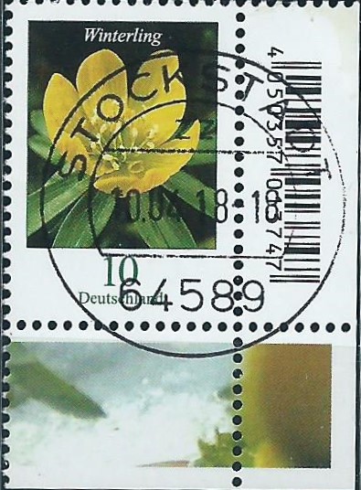 Es geht los mit dem 10 Cent-Wert Winterling aus der rechten unteren Bogenecke mit Stempel Stockstadt vom 10.4.18:
