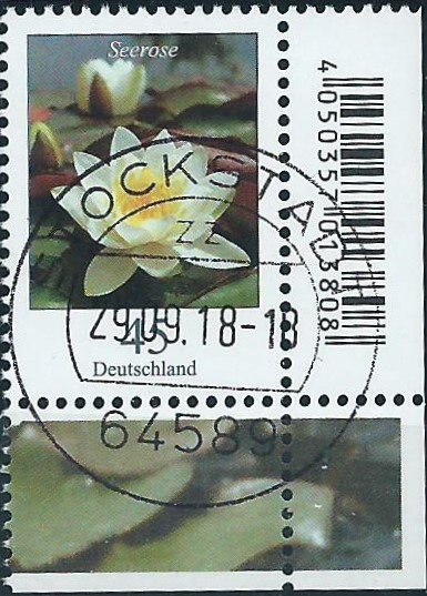 Und noch eine Seerose zu 45 Cent, hier aus der rechten unteren Bogenecke mit Stempel Stockstadt vom 29.9.18: