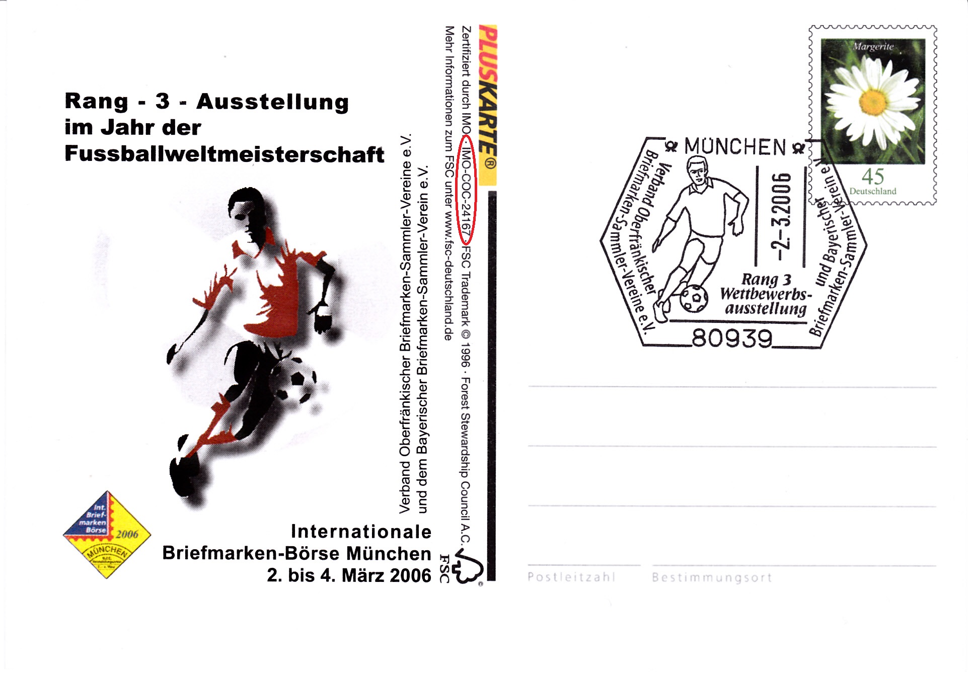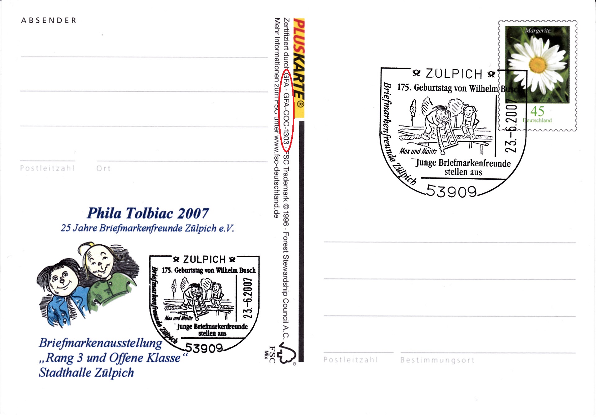 Postkarte mit dem Wertstempel Margerite (MiNr 2451) mit angedeuteter Zähnung mit Absendervordruck (MiNr P 167 I b) mit privatem Zudruck und dazu passendem Sonderstempel. Diese Karte hat die Zertifikationsnummer "GFA-COC-1303" (rot markiert).