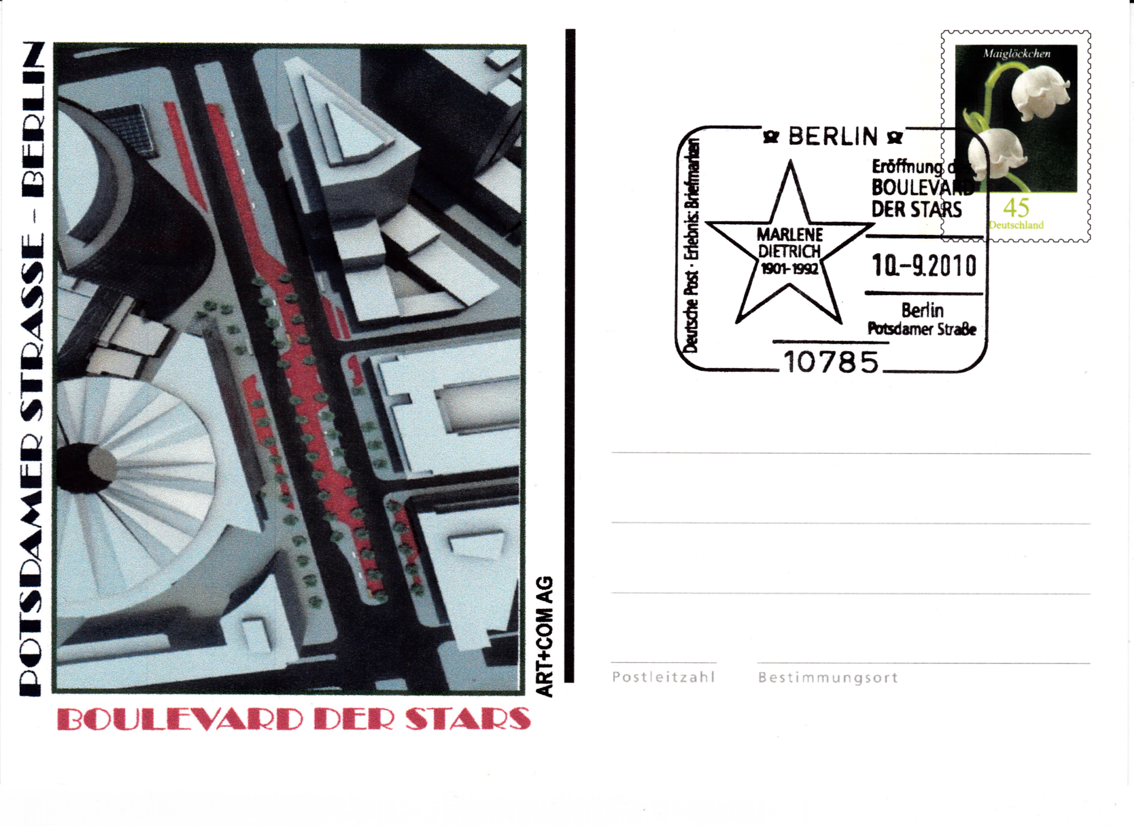 Und gleich noch eine mit einem Zudruck und einem Sonderstempel aus Berlin vom 10.9.2010 zur Eröffnung des Boulevard der Stars.