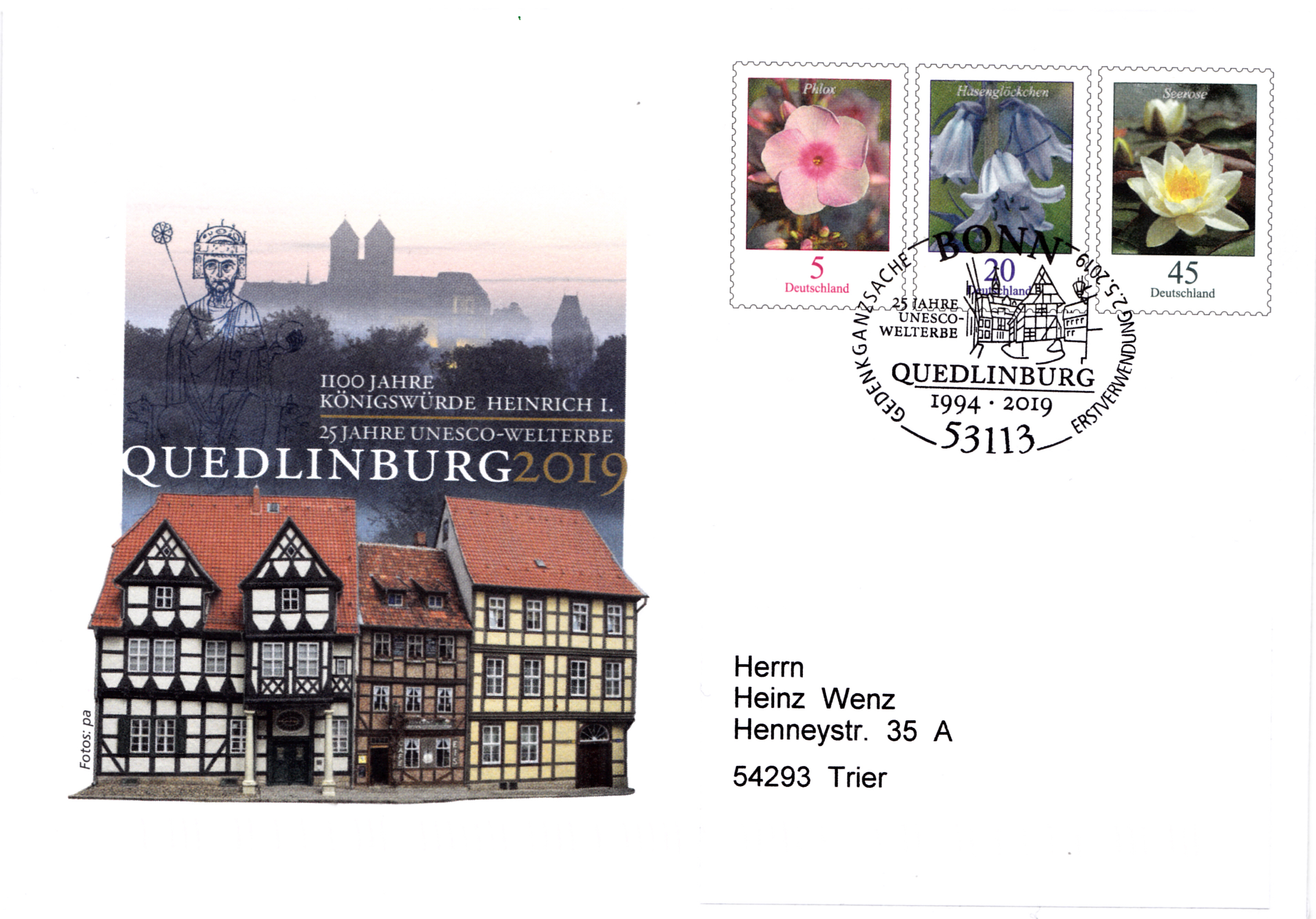 Zur Gedenkganzsache zum Thema "1100 Jahre Königswürde Heinrich I. und 25 Jahre Quedlinburg Welterbe" mit drei Wertstempel im Muster der Marken zu 5 Cent Phlox, 20 Cent Hasenglöckchen und 45 Cent Seerose wurde in Bonn auch ein Erstverwendungsstempel eingesetzt.