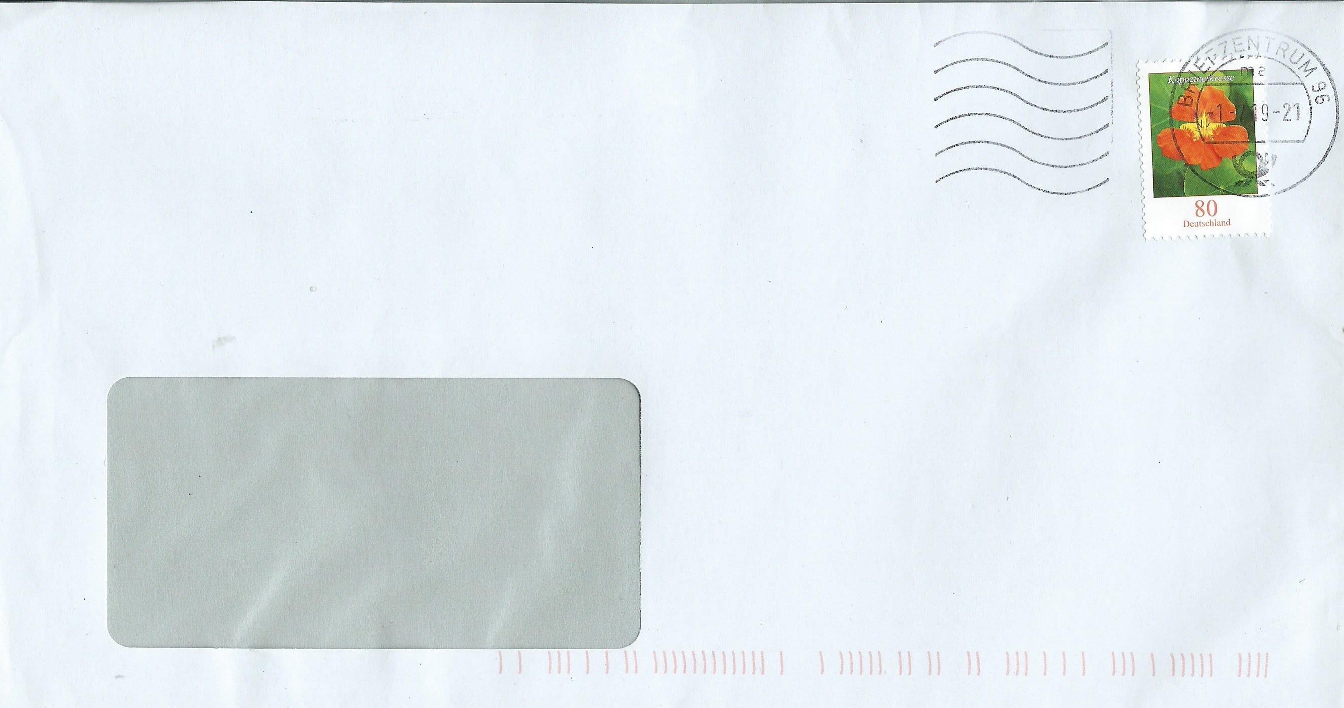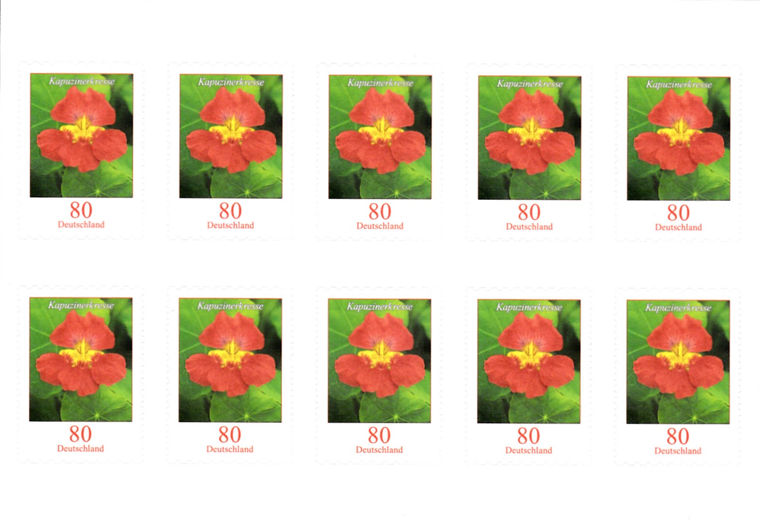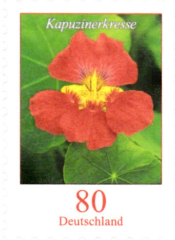 Einmal der Wert zu 80 Cent Kapuzinerkresse nassklebend mit Ortsstempel Lübeck Kronsforder. Der Ortskundige weiss natürlich, dass damit die Kronsforder Landstraße gemeint ist, für Ortsfremde hört sich der Stempeltext etwas merkwürdig an.