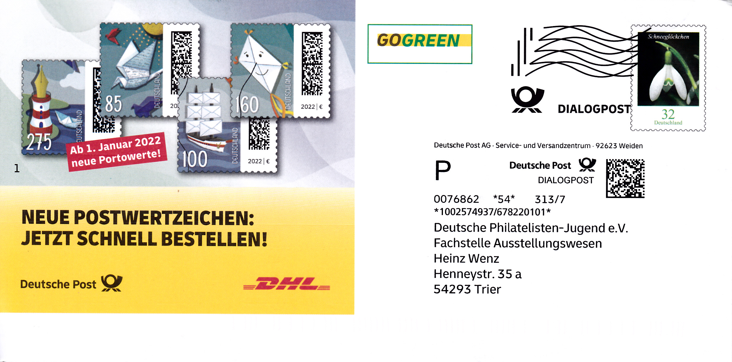 Es folgt ein ähnlicher Faltbrief 210 mm x 102 mm mit Wertstempel der 32 Cent-Marke der Dauerserie "Blumen" (MiNr 3655) "Kleines Schneeglöckchen (Galanthus nivalis)" mit aufgedruckter Zähnung. Der Wertstempel ist mit einer Welle "Dialogpost" entwertet.