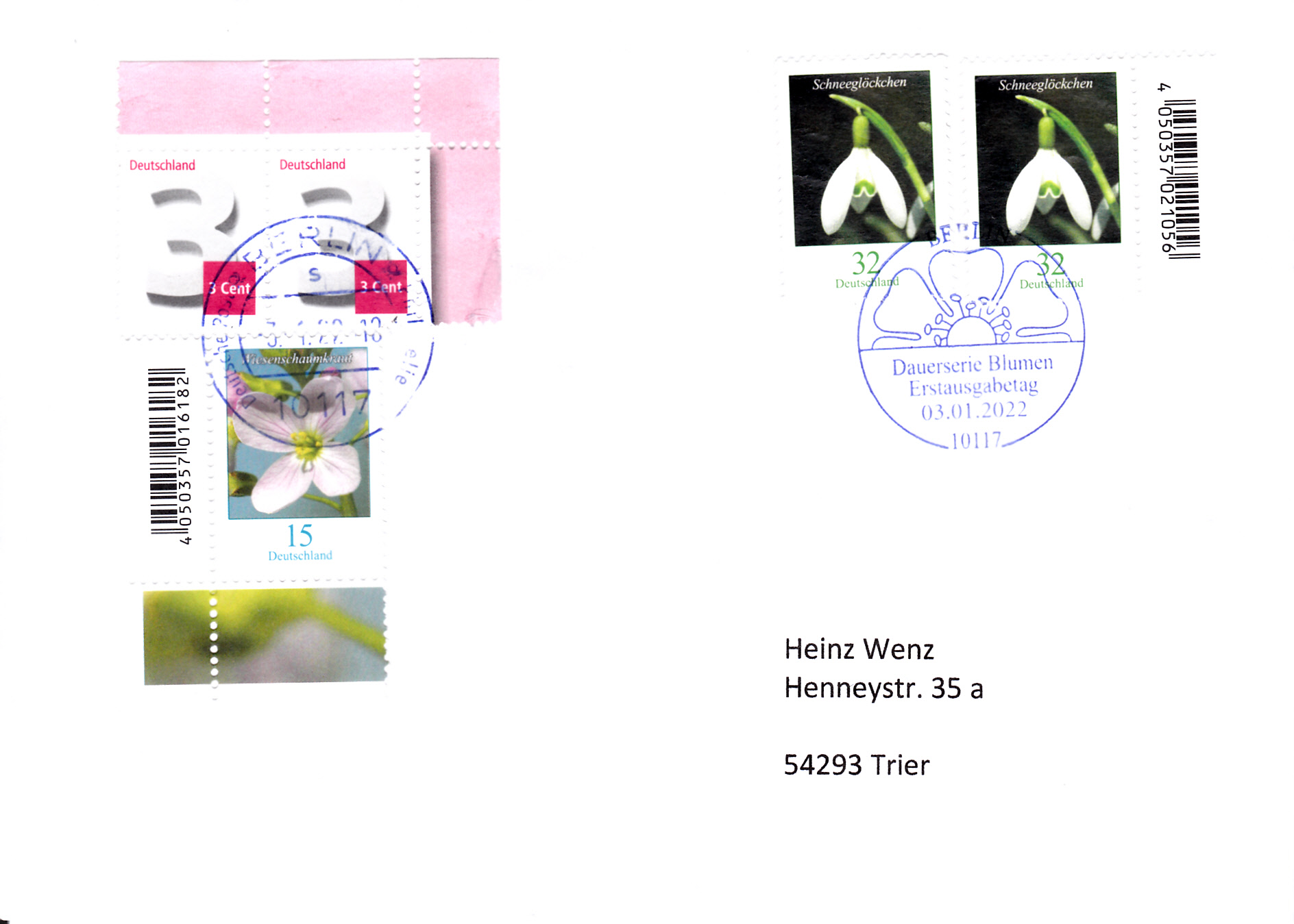 Brief mit zwei Marken zu 32 Cent (MiNr 3655) mit dem Kleinen Schneeglöckchen (Galanthus nivalis) und Zusatzfrankatur. Die beiden Blumenmarken sind mit dem Ersttagsonderstempel Berlin entwertet, die Zusatzfrankatur mit einem normalen Tagesstempel.