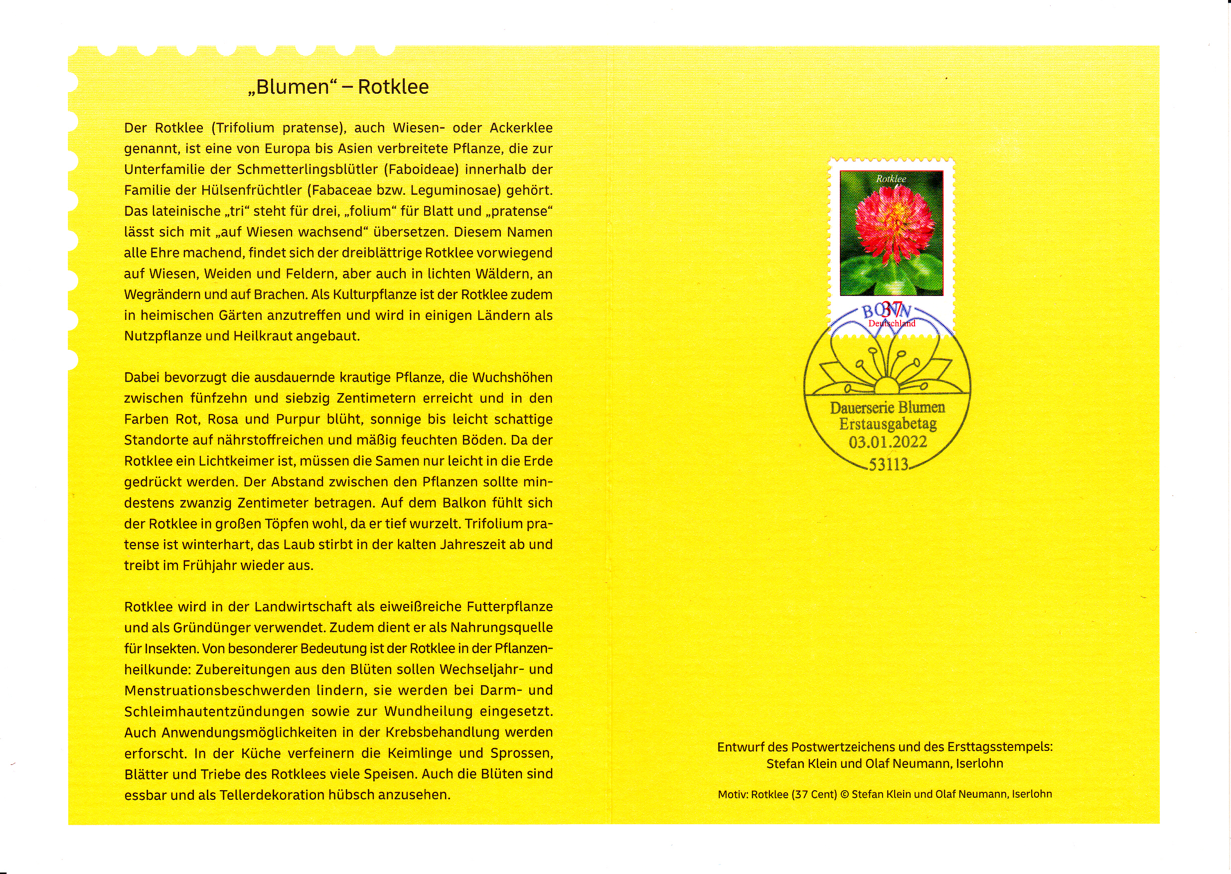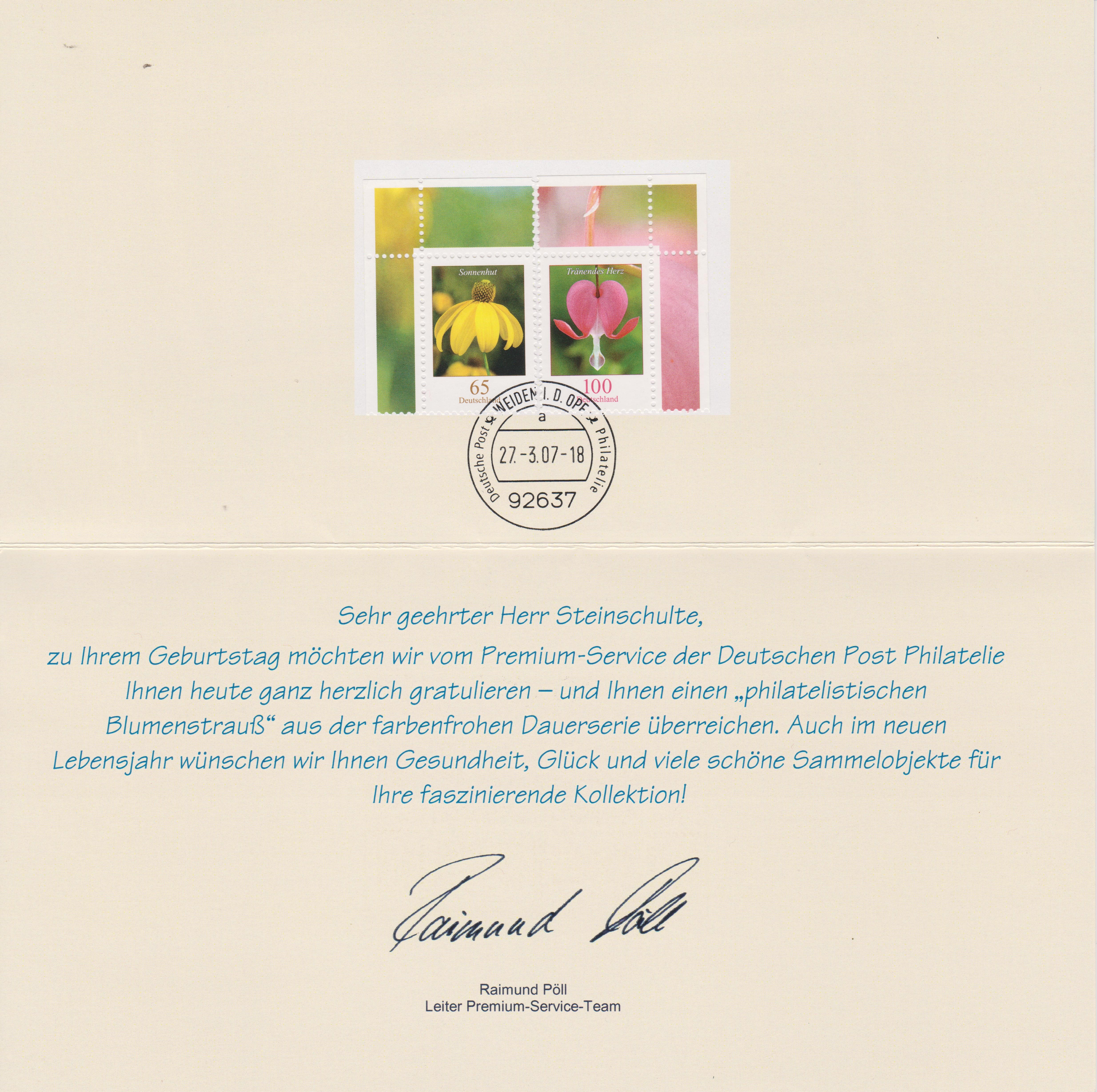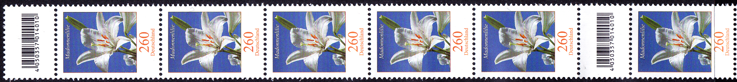 Die Marke zu 260 Cent (MiNr 3207) der Dauerserie Blumen wurde im Bogen zu 10 Marken und in Rollen zu je 200 Marken gedruckt. Bei den Rollen, die ab 2016 gedruckt wurden befindet sich auf jeder 5. Marke rückseitig eine Zählnummer, bei den Rollen, die ab 2017 hergestellt wurden folgt auf jede 5. Marke (mit Nummer) ein Zwischenfeld mit EAN-Codierung.