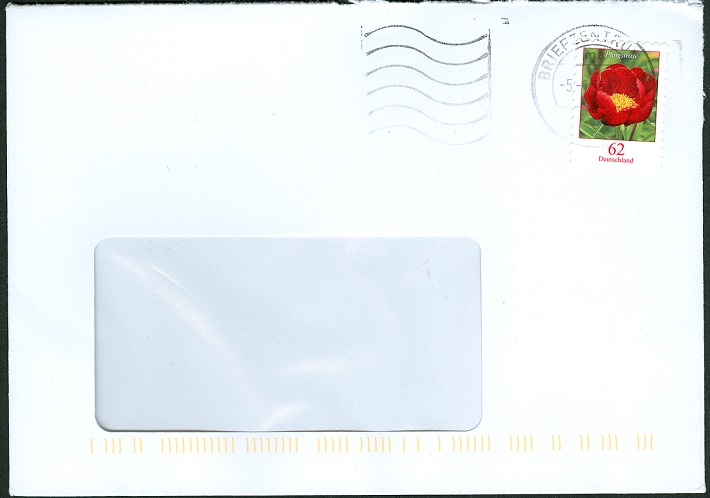 Eine EF (Einzelfrankatur) der 62er-Pfingstrose aus der ersten Tarifwoche 2015.