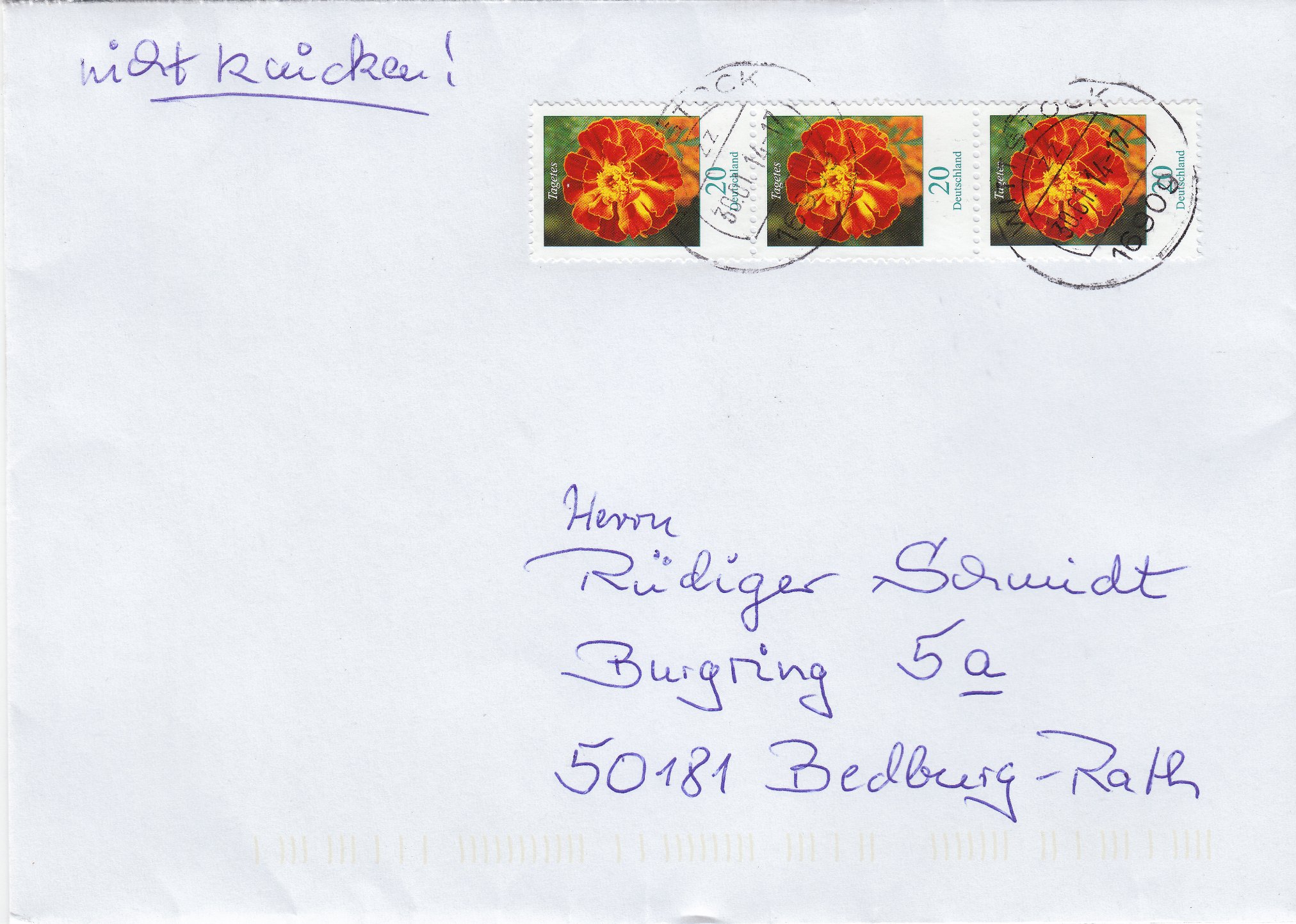 Ebenfalls aus meinem aktuellen Posteingang stammt dieser Standardbrief (0,60 €), der am 30.01.2014 portorichtig mit einem Dreierstreifen des 20 Pf Wertes der Dauerserie Blumen, naßklebend, frankiert wurde: