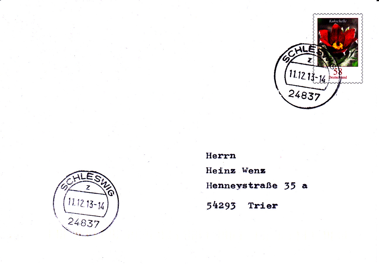 Es gibt auch Ganzsachen mit Werten aus der Dauerserie Blumen. Hier ein sogenannter "Plusbrief" mit einem Wertzeicheneindruck von 58 Cent (Standardbrief von 1.1.2013 bis 31.12.2013). Er wurde an Geschäftskunden mit einer Mindestabnahme von 100 Stück und am Schalter in Packungen zu je 10 Stück verkauft. Das gezeigte Exemplar trägt einen Stempel vom 11.12.13 14 Uhr.