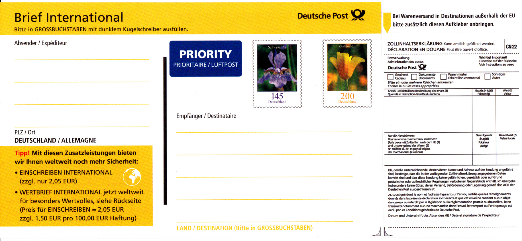 Ab November 2012 wurden sogenannte "Adresszettel Brief International" für Auslandssendungen bis 500 Gramm (MiNr AZ 1) mit dem Eindruck der beiden Wertzeichen zu 145 Cent (Schwertlilie) und 200 Cent (Goldmohn) von der Post angeboten. Diese wurden zusammen mit einer Versandhülle in Packungen zu 1 Stück für 4,90 € oder drei Stück für 13,90 € verkauft. Die Adresszettel sind selbstklebend und auf einer Trägerfolie aufgebracht und rechts daneben befindet sich eine Zollinhaltserklärung.