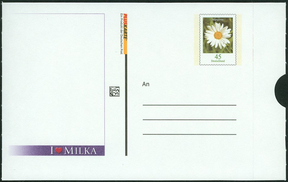 Eine Sorte Pralinepackungen der Firma Milka beinhalteten vorübergehend Pluskarten mit einem Wertzeicheneindruck der MiNr 2451. Die Karten sind waagrecht zusammenhängend gedruckt worden (wie Marken in einer Rolle), sie weisen nämlich rechts und links Abrissspuren auf. Es gibt vorderseitig verschiedene Motive. Ich zeige mal die Motive, die mir zur Zeit vorliegen.