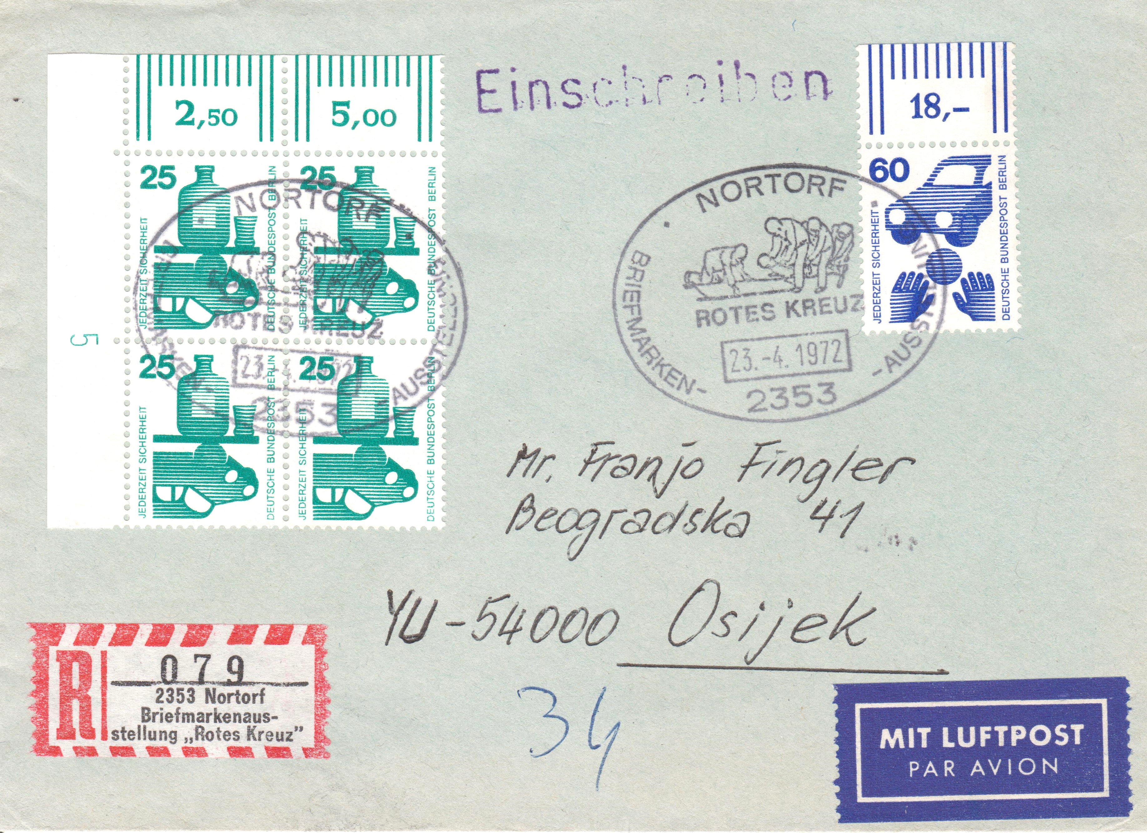 Eckrandviererblock der Wertstufe 25 Pf mit Druckerzeichen "5" im linken Bogenrand als Teil einer Mischfrankatur am 23.04.1972 auf Luftpost-Einschreibebrief nach Jugoslawien: