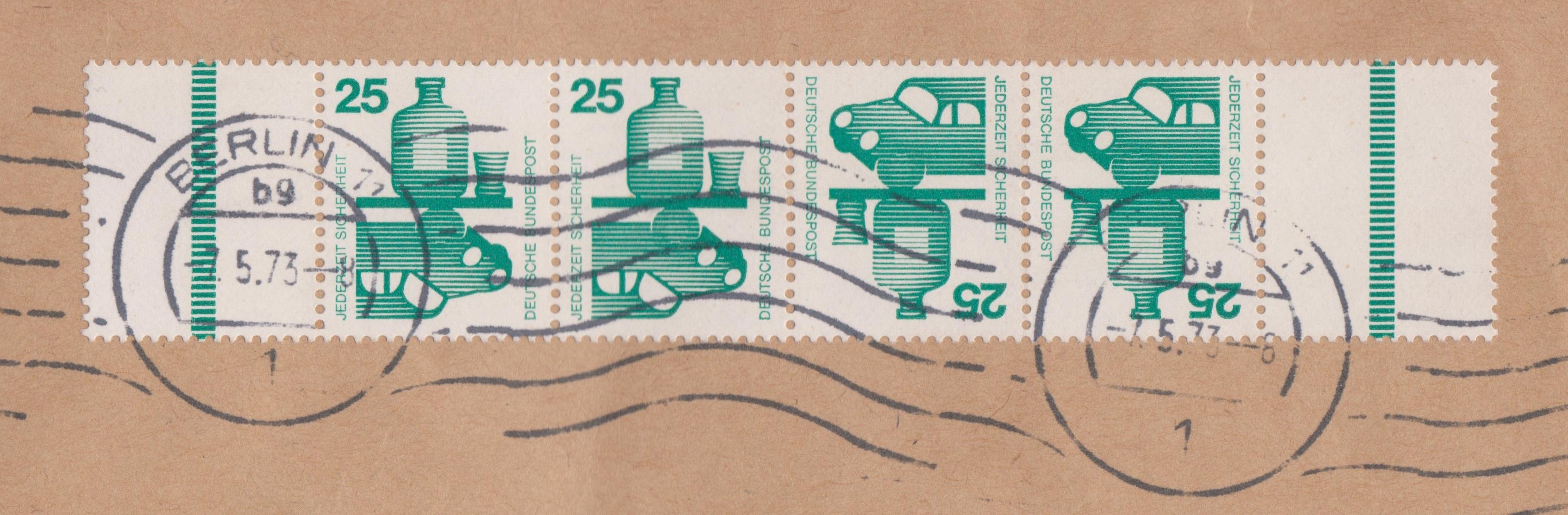 Hier ein Zusammendruck aus dem Markenheftchenbogen 15 am 07.05.1973 gelaufen ab Berlin, wo diese Bund-Ausgabe ebenfalls gültig war: