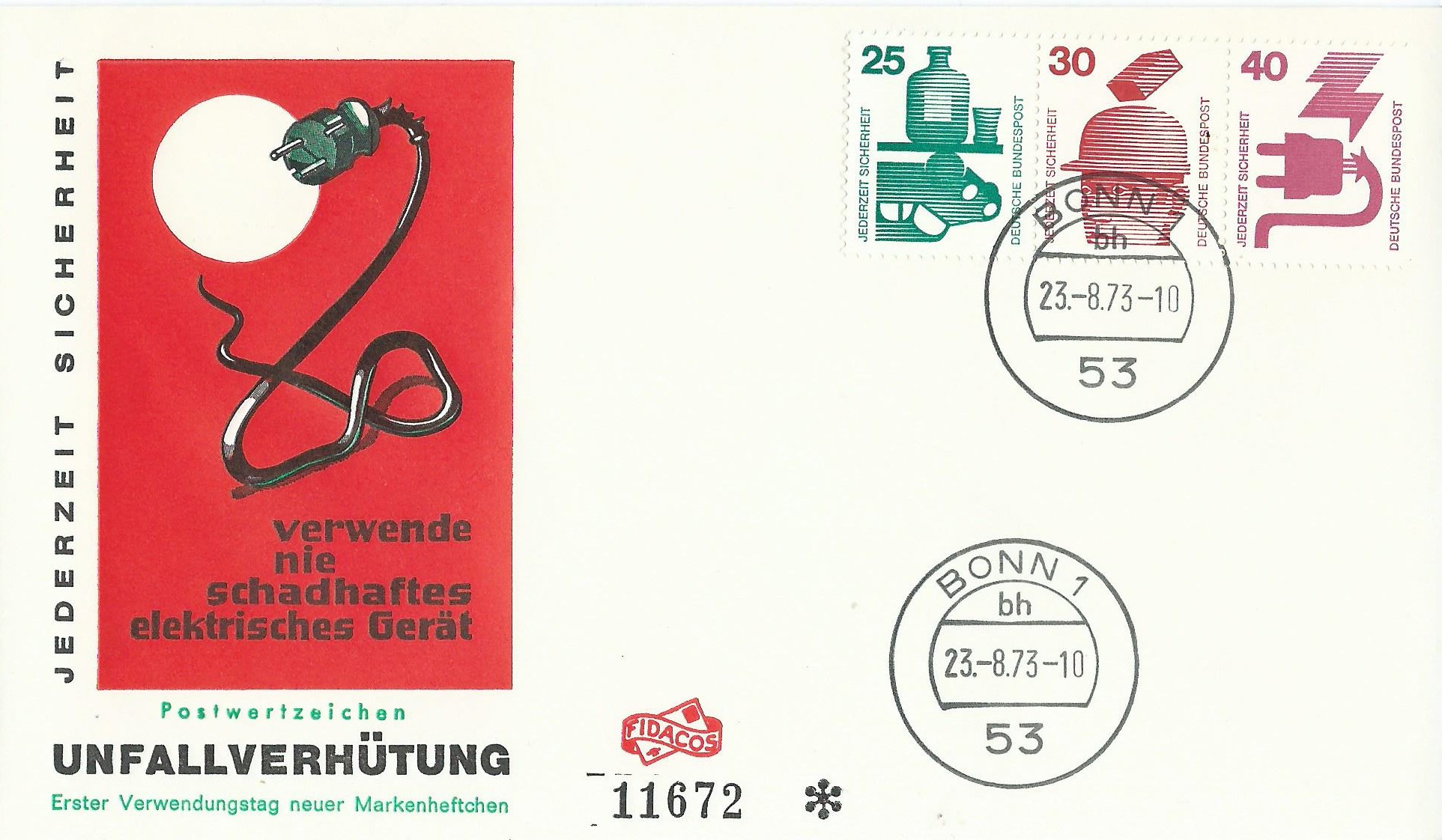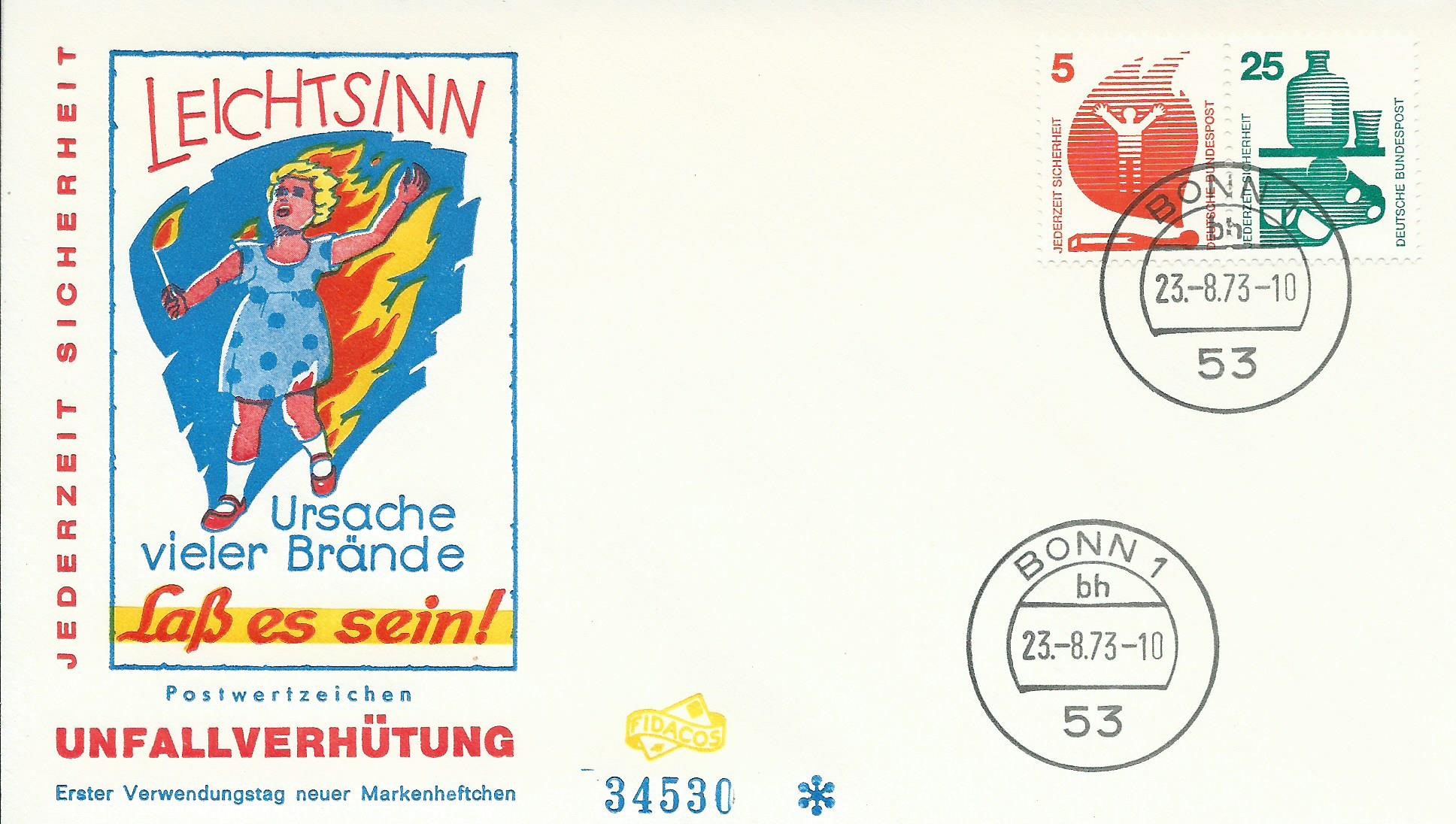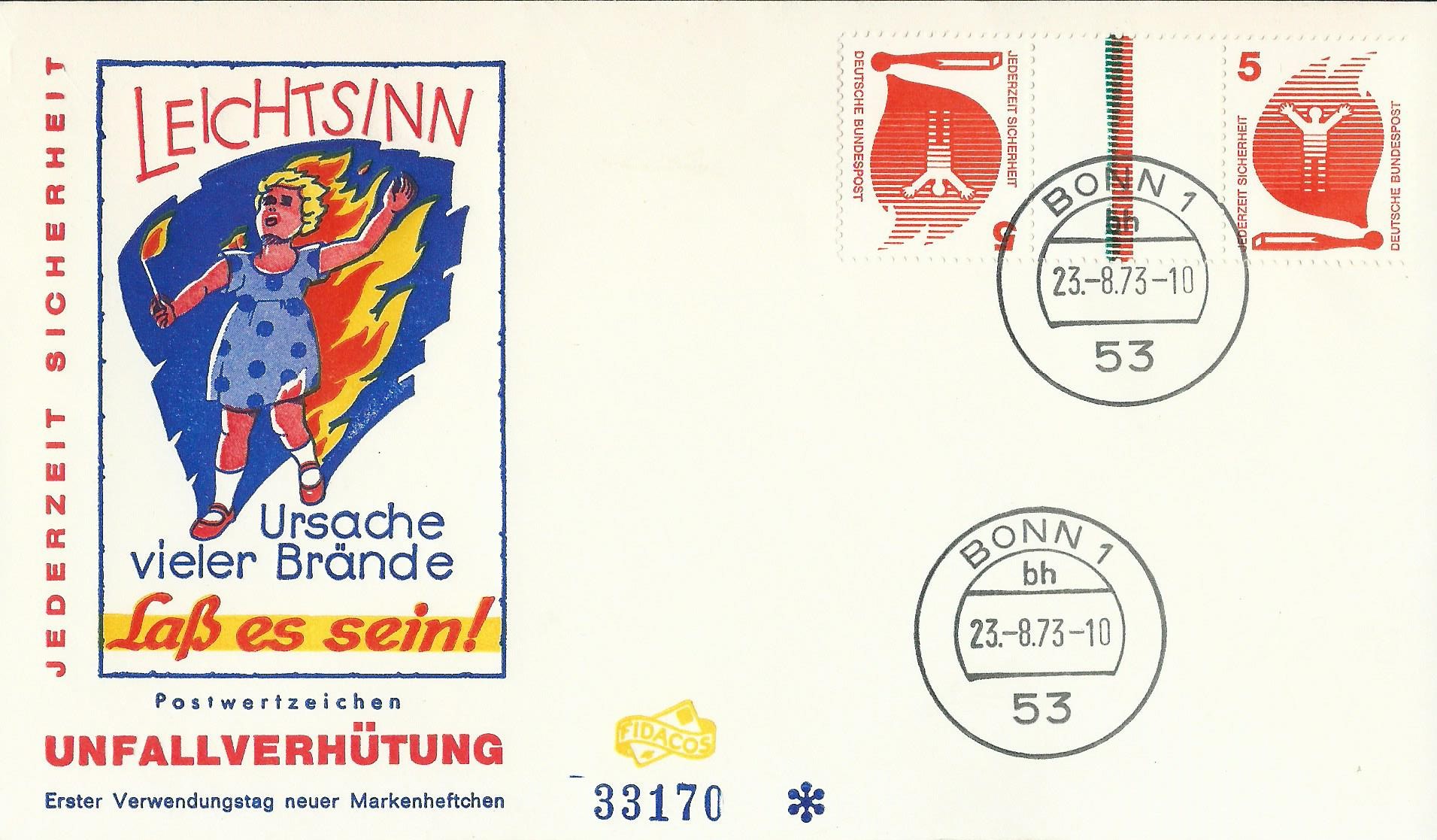 Nun folgen hier einige Ersttagsbelege mit Zusammendrucken vom Markenheftchenbogen und –blatt zeigen. Wobei, …, ich hoffen mal, dass es auch welche sind. Der Michel schreibt als Ausgabezeit nur „August 1973“, ohne einen bestimmten Tag zu nennen. Zumindest sind die folgenden Belege alle am 23.8.73 in Bonn gestempelt worden und haben „offizielles Aussehen“, das lassen wir mal so dahin gestellt.