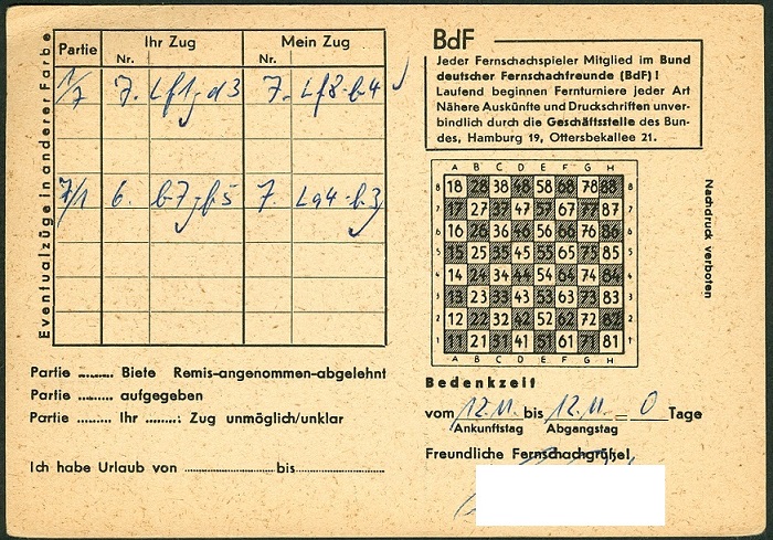 Fernschach ist nach wie vor in Deutschland beliebt. Üblicherweise wurden die einzelnen Züge per Brief oder Postkarte mitgeteilt. Später gab es dann Karten-Vordrucke, die nur noch ausgefüllt zu werden brauchten.