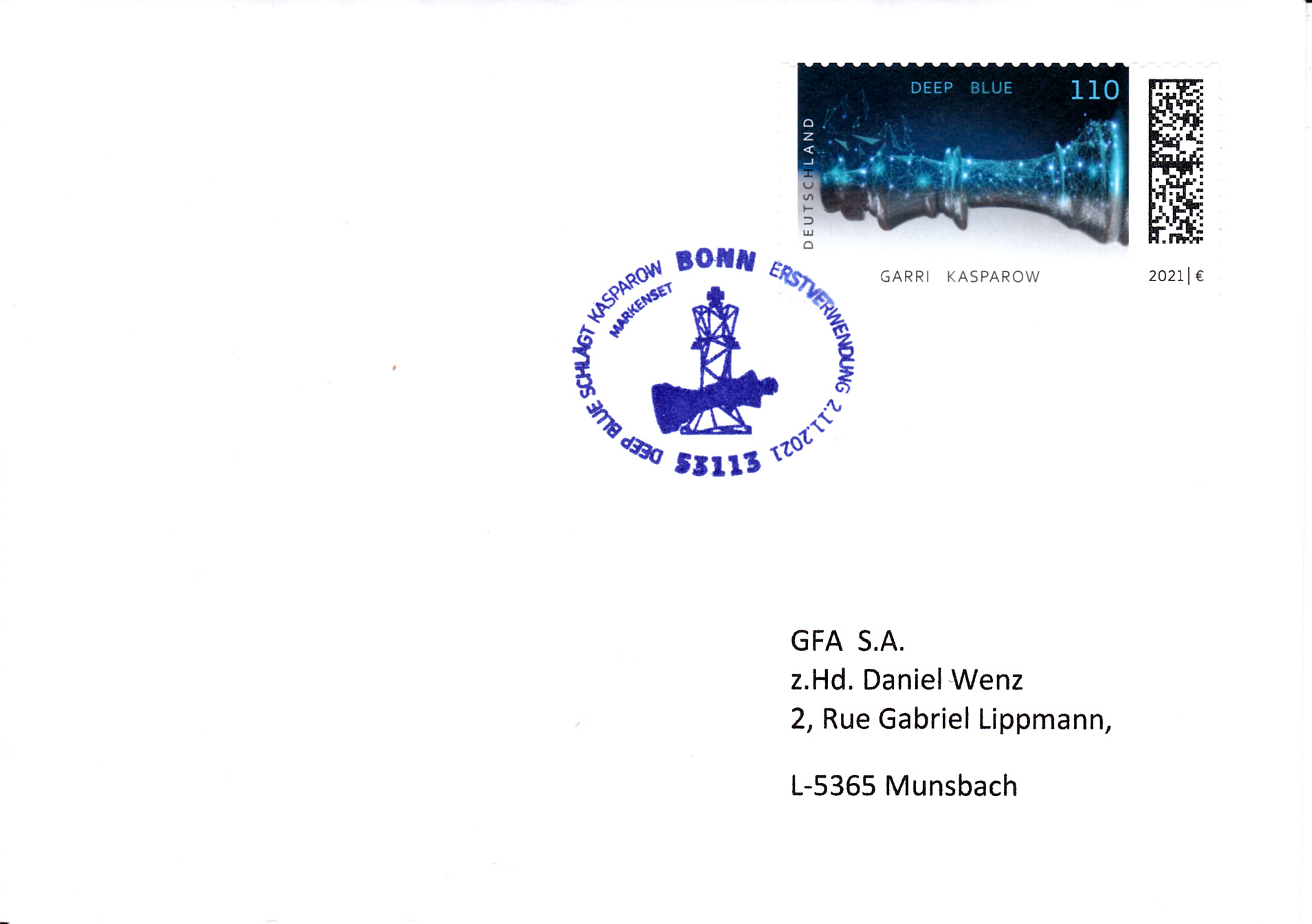 Klappkarte des Vorstandsvorsitzenden der Deutschen Post AG mit der Marke "Schachcomputer Deep Blue schlägt Weltmeister Garri Kasparow" (MiNr 2895) und dem Ersttagsonderstempel Bonn.