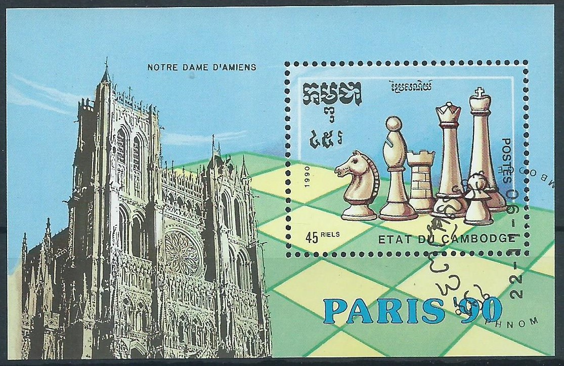 Der zweite stammt ebenfalls aus Kambodscha und wurde am 22.11.90 gestempelt. Er zeigt auch alle 6 Schachfiguren und den Zudruck Paris ´90. In dem Jahr fand in Paris die Schachweltmeisterschaft statt.