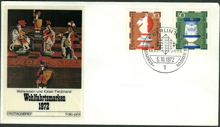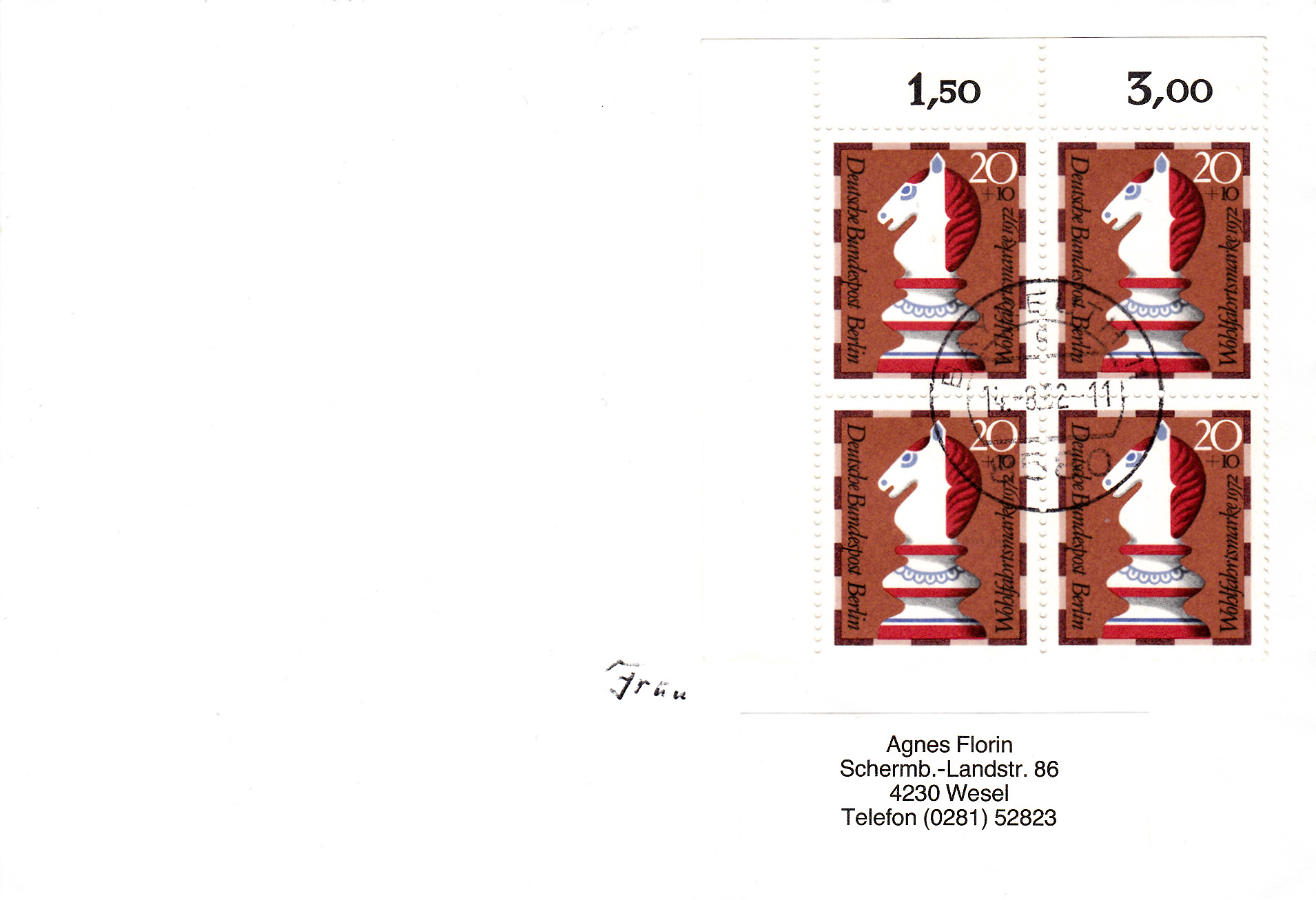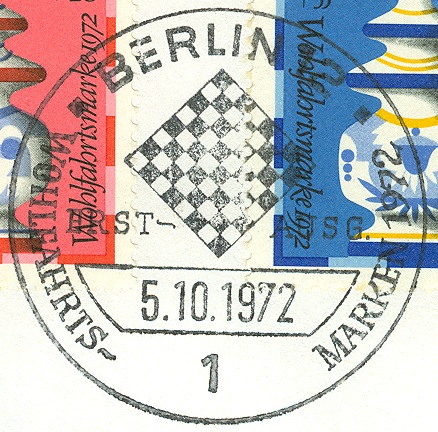 1972 verausgabte die verantwortliche Postverwaltung für Westberlin 4 Schach-Motivmarken: Springer, Turm, Dame und König.