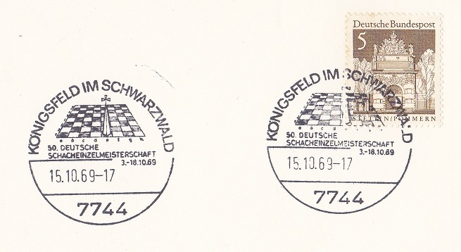 Fernschachtreffen 1971 fand in Glücksburg statt. Von diesem Sonderstempel könnte es 2 Geräte geben, wenn man die "2" hinter "OSTSEE" in diese Richtung deutet. Das Stempeldatum aus dem Juni lässt eher ein gemütliches Beisammensein vermuten, als ein ehrgeiziges "Fernschachturnier". Obwohl Schachspieler Einzelkämpfer sind, vor allem als Fernschachspieler, wollen sie irgendwann aber wissen, wer ihre Partner bzw. Gegner sind.