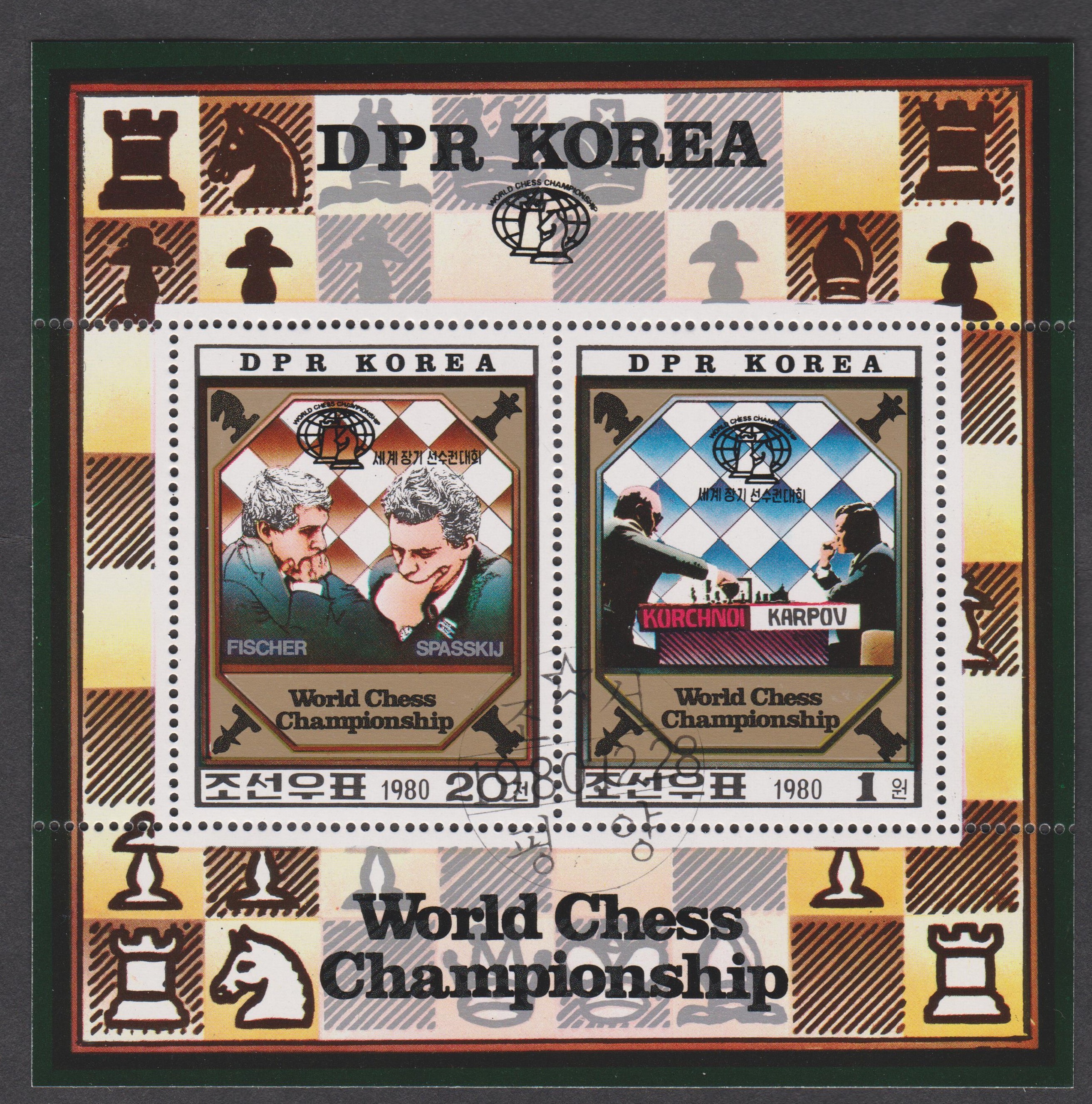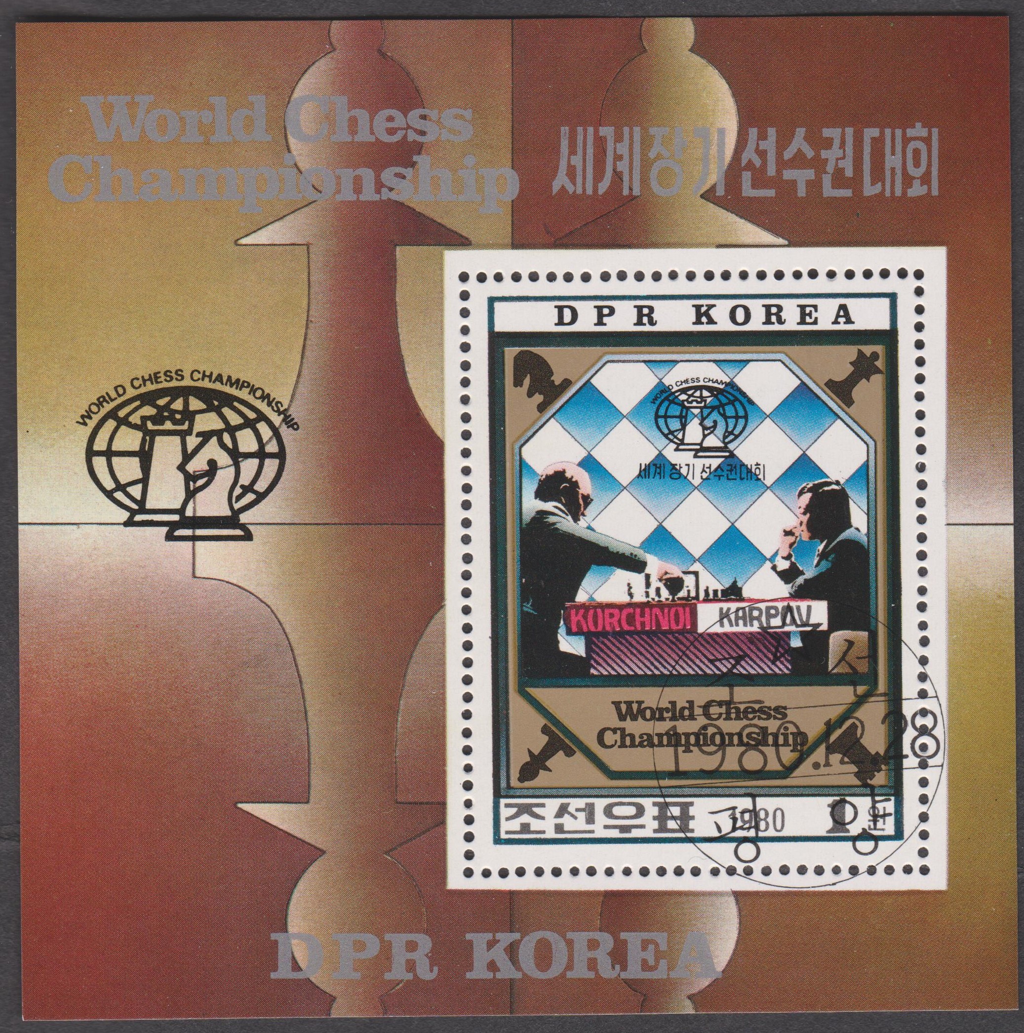 Nordkorea Block 212 mit MiNr. 2720 zeigt den Weltmeister Gari Kasparov bei einer Weltmeisterschaftspartie mit Alexander Karpow: