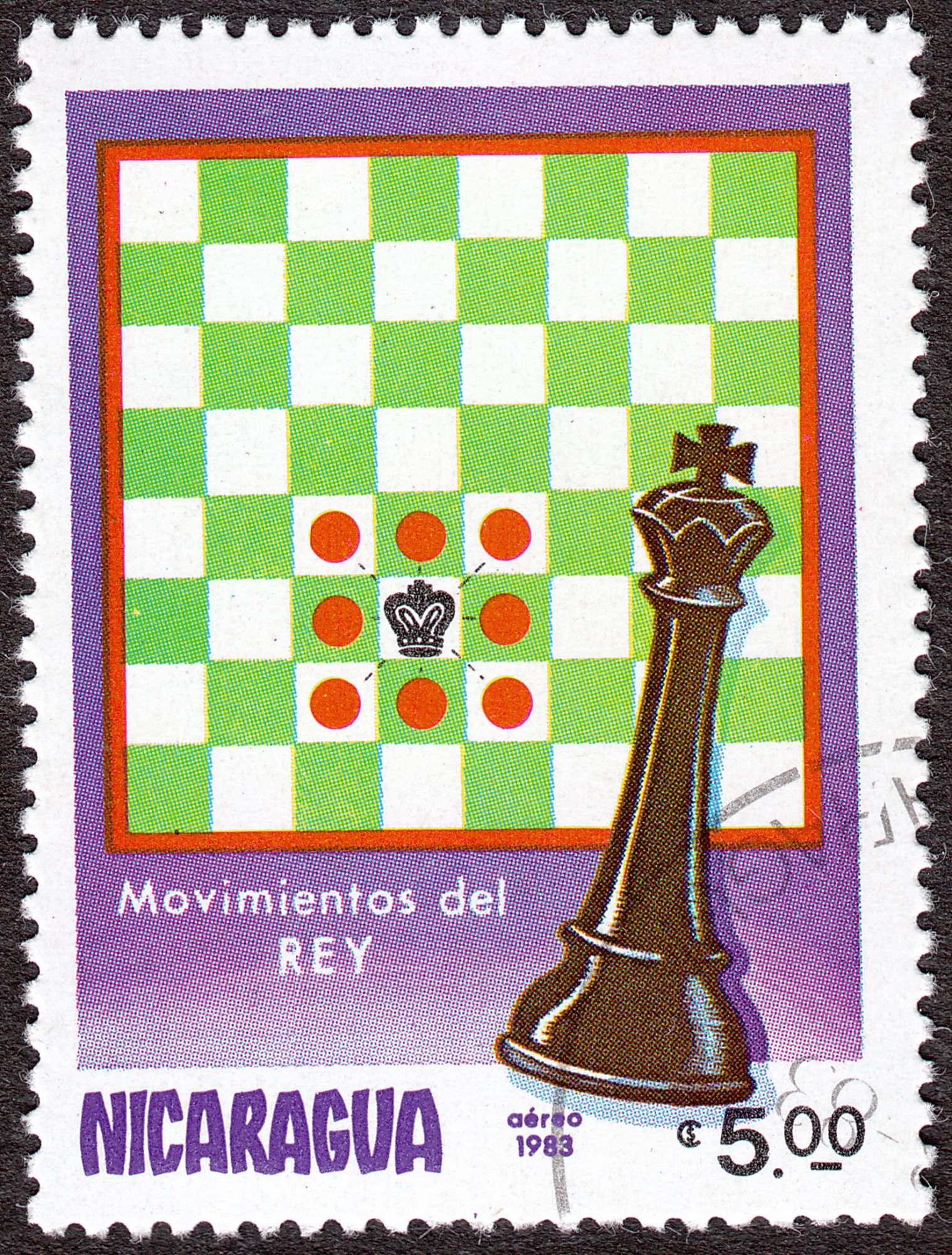 Somit resultieren maximal 8 verschiedene Züge, die man für den König zur Auswahl hat, was auf dieser Marke aus Nicaragua für den schwarzen König sehr anschaulich dargestellt ist: