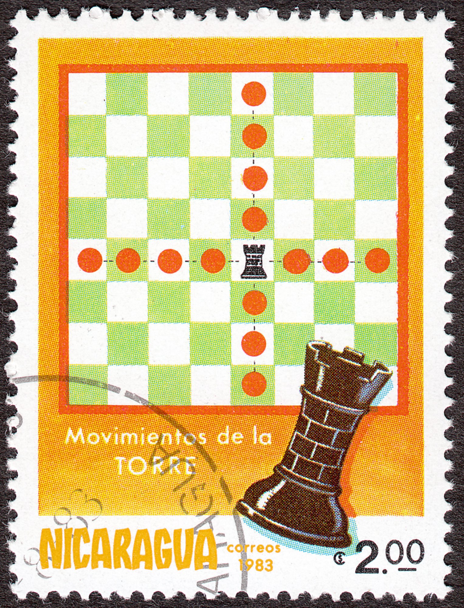 Die 14 Zugmöglichkeiten dieses schwarzen Turmes verdeutlich dieses Postwertzeichen aus Nicaragua:
