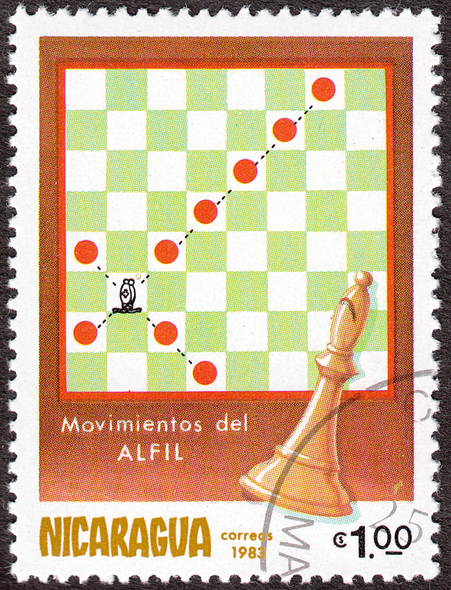 Auf dieser Marke aus Nicaragua wurden die 9 Zugmöglichkeiten eines weißen Läufers dargestellt: