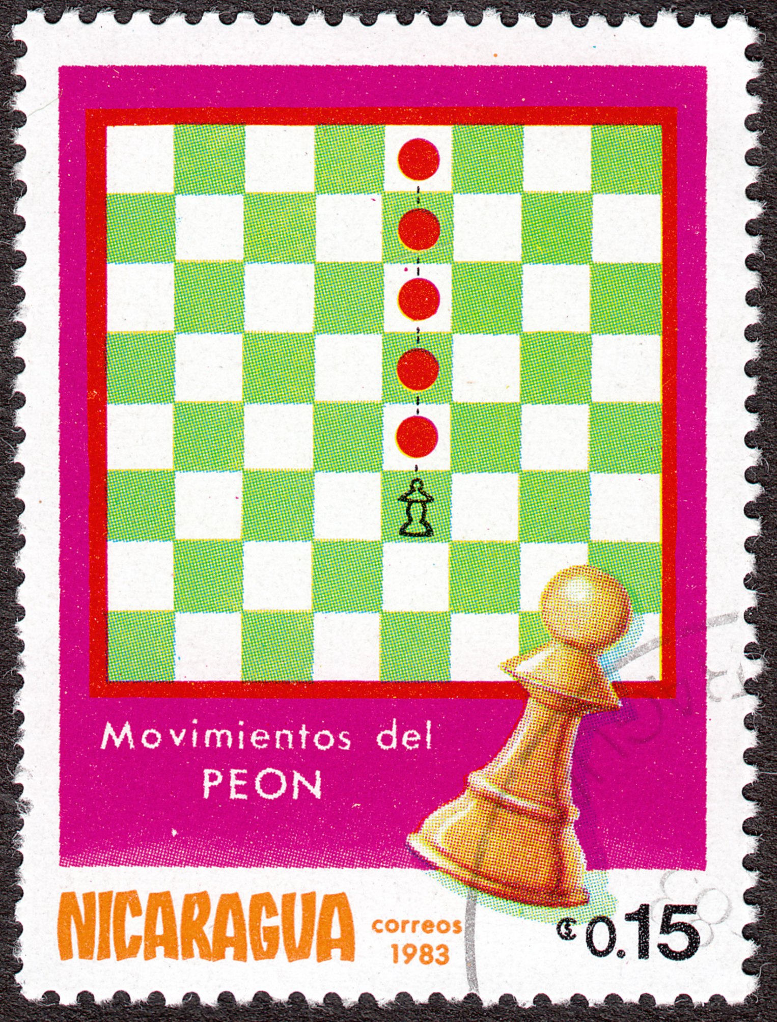 Diese Marke aus Nicaragua verdeutlicht den Weg des Bauern von seiner Ausgangsposition, wie er mit 5 Zügen die gegnerische Grundlinie erreichen kann:
