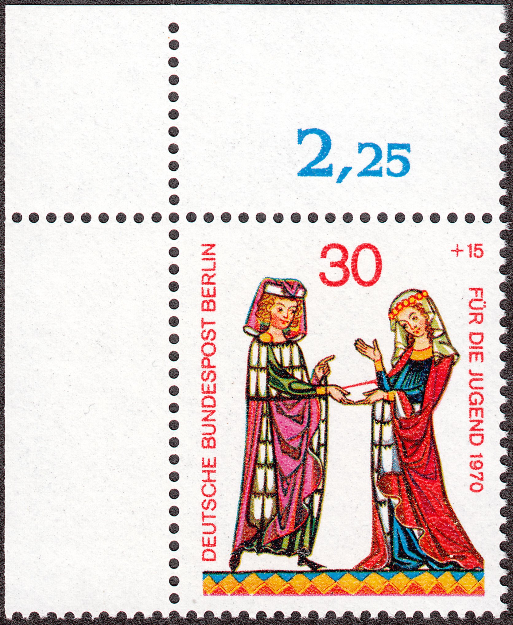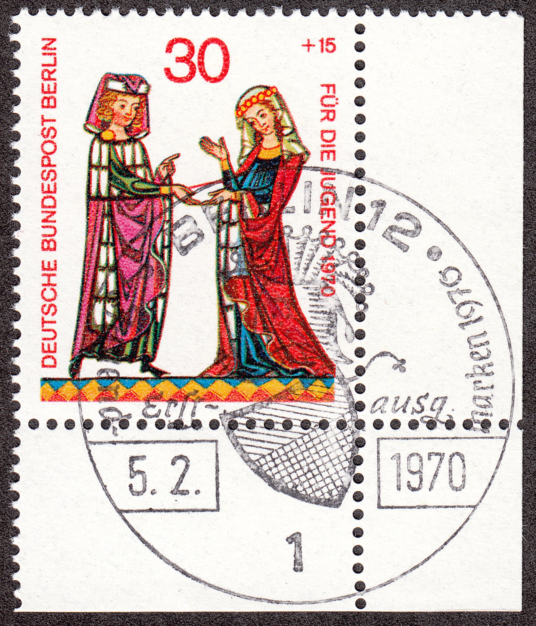 Der ESST nimmt Helm und Wappenschild als Motive mit auf, die in der Originalabbildung aus der Großen Heidelberger Liederhandschrift = Codex Manesse zu sehen sind, die als Basis für die Wertstufe 30+15 Pfennig mt dem Motiv Burkart von Hohenfels diente: