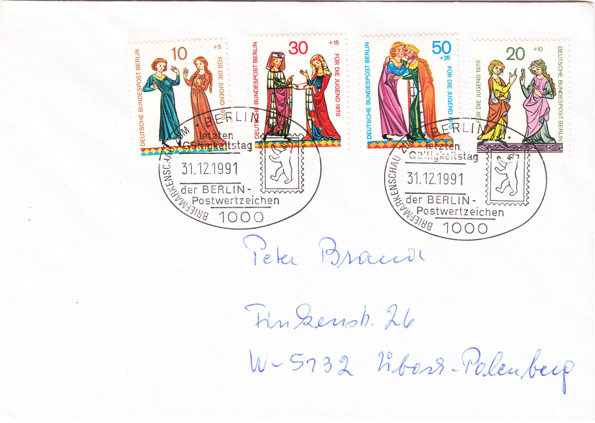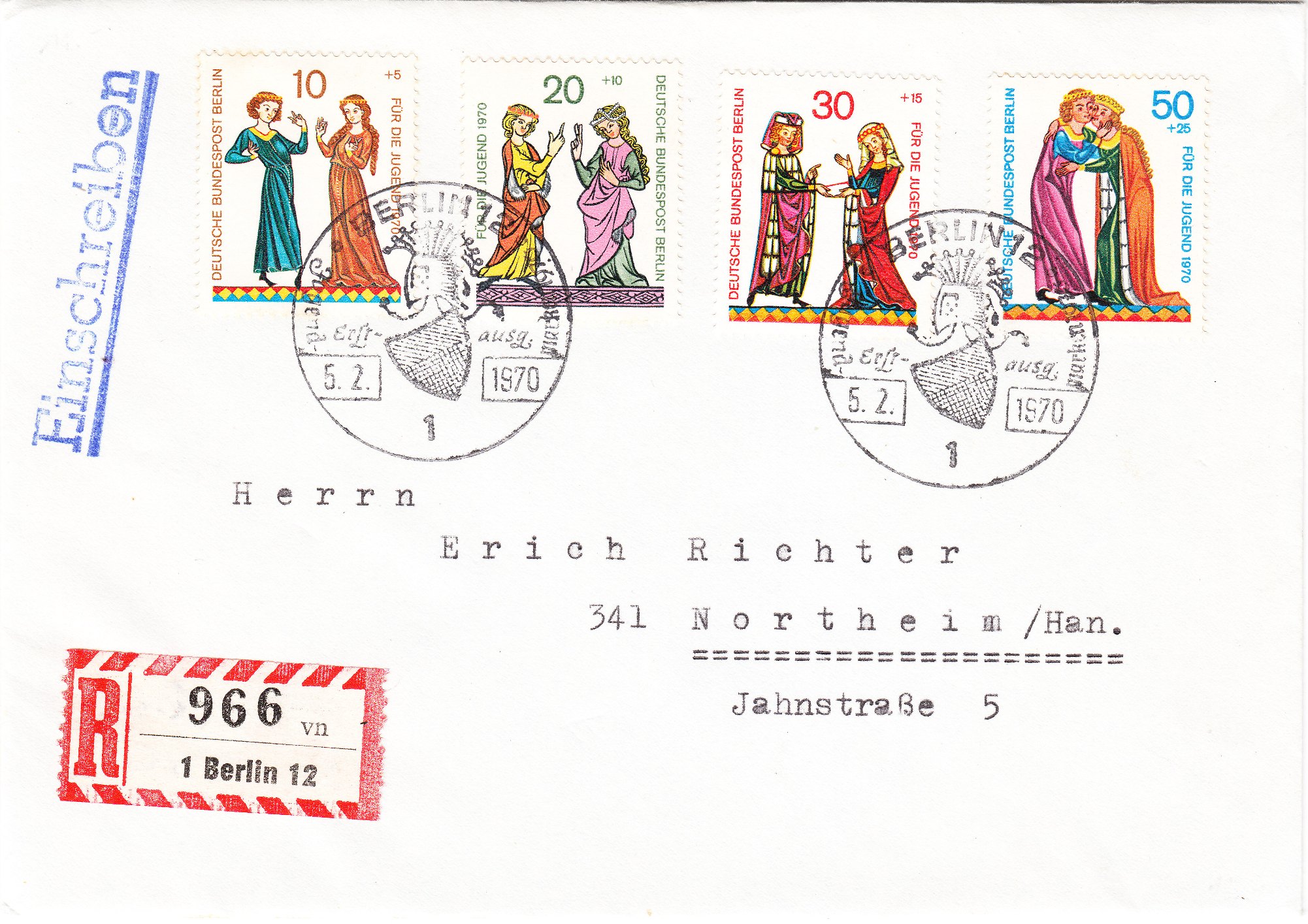 Die am 05.02.1970 erschienenen Jugendmarken 1970 zeigen als Motiv Minnesänger, hier ein Satzbrief als FDC, als Fernbrief (30 Pfennig) per Einschreiben (80 Pfennig) portogerecht: