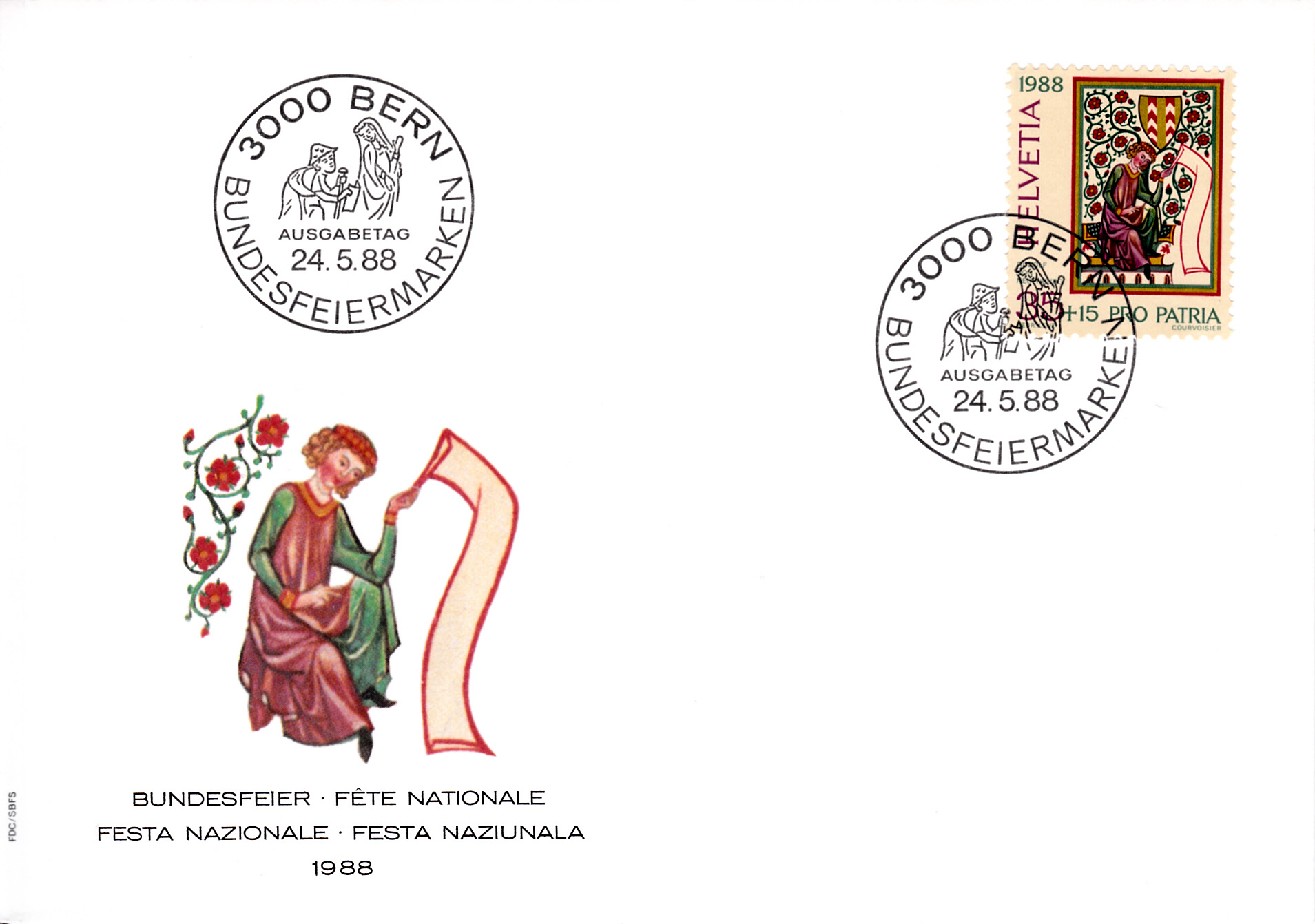 Auf diesem FDC sind alle vier Werte der Serie "Pro Patria" 1988 verklebt worden.