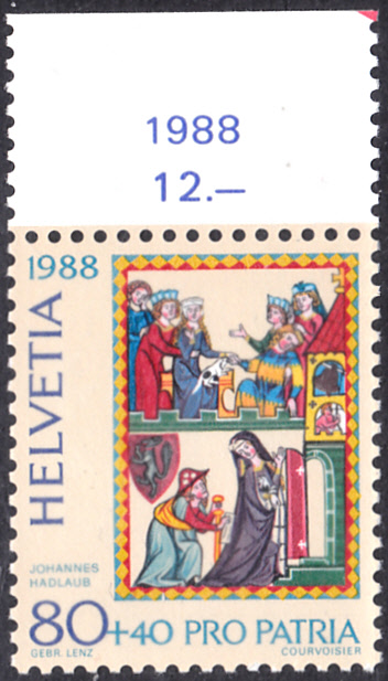 Auf dieser Marke aus der Schweiz (MiNr 1374) sehen wir eine Darstellung aus dem Codex Manesse zu Johannes Hadlaub.