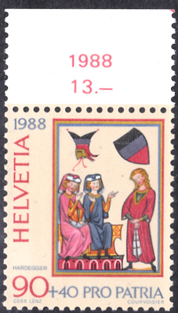 Auf dieser Marke aus der Schweiz (MiNr 1374) sehen wir eine Darstellung aus dem Codex Manesse zum Hardegger.