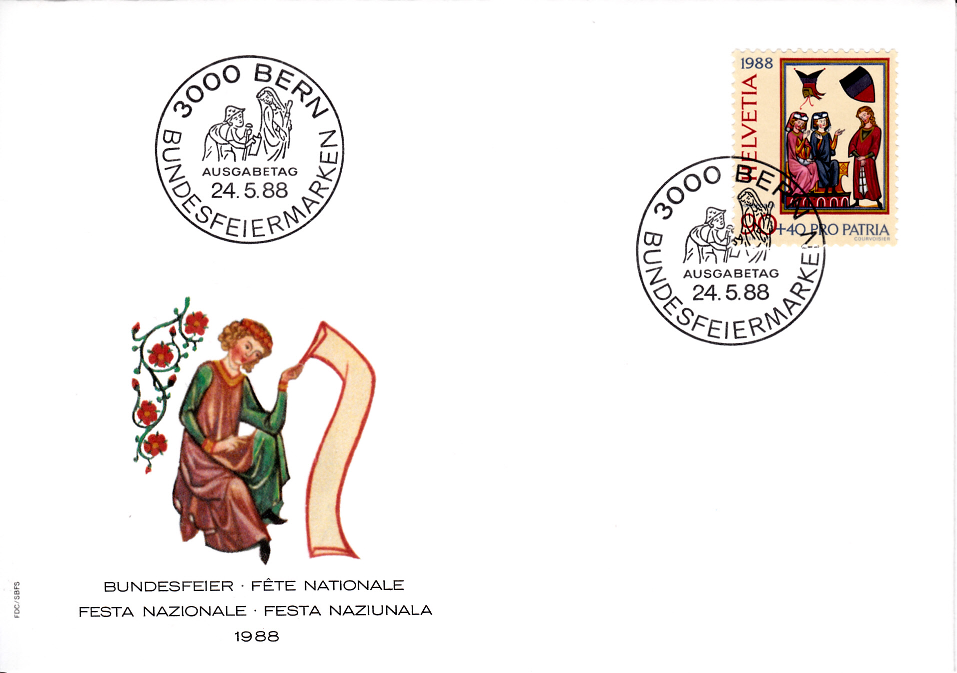 Auf diesem FDC sind alle vier Werte der Serie "Pro Patria" 1988 verklebt worden.