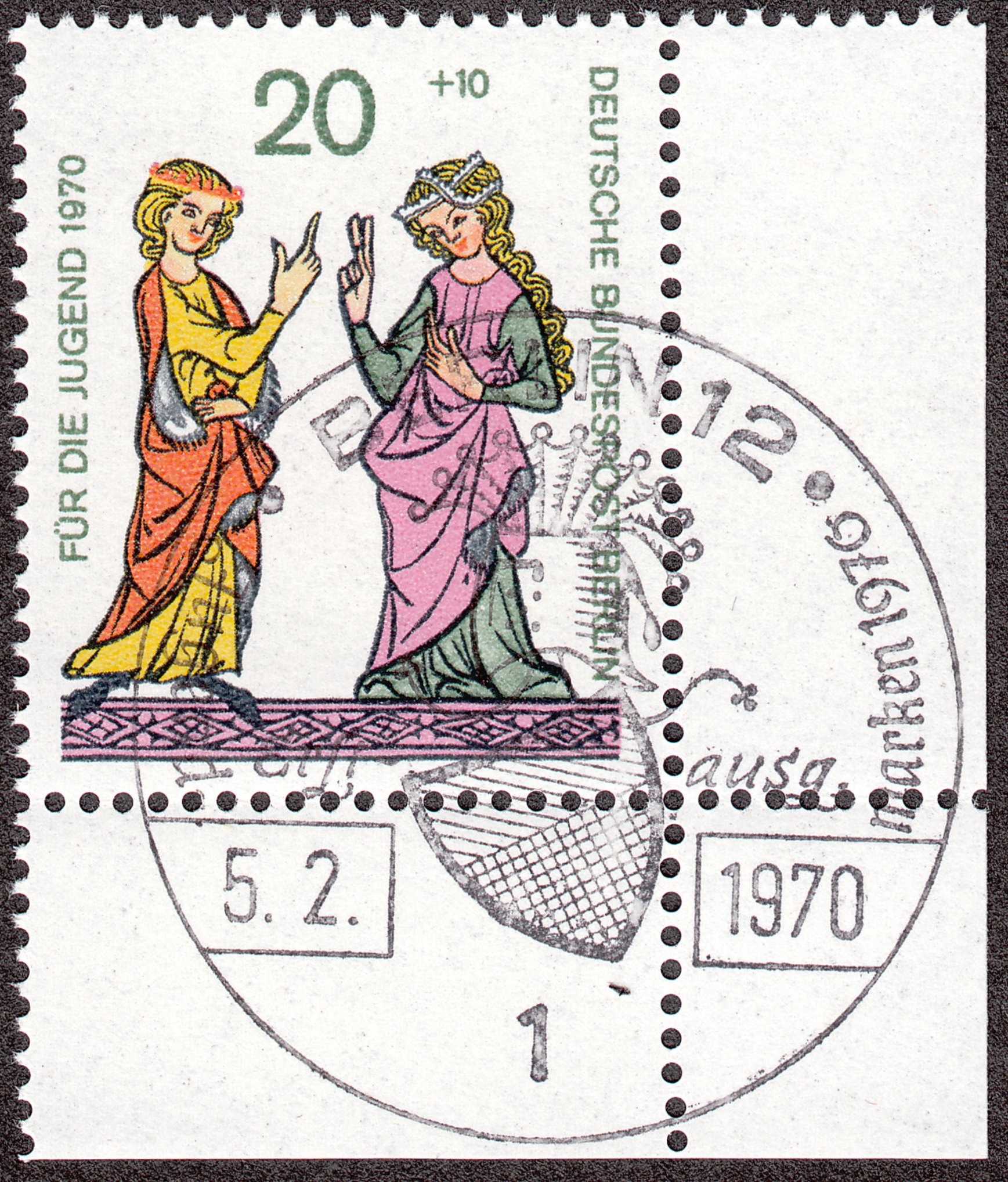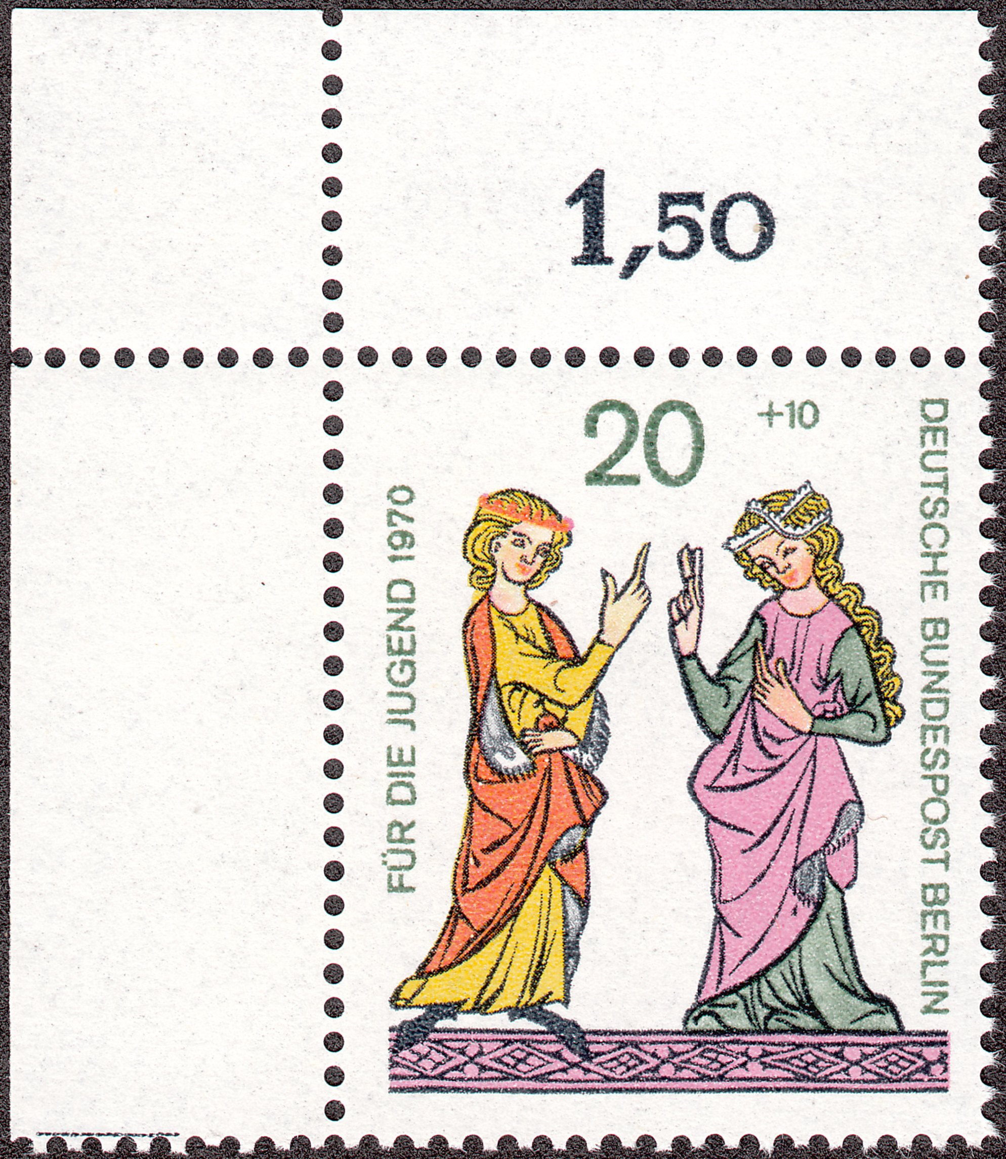 Diese Illustration diente als Vorlage für das Postwertzeichen Berlin MiNr. 355, hier ein Eckrand 1 mit Passerstrich im linken Bogenrand zwischen Feld 1 und Feld 11: