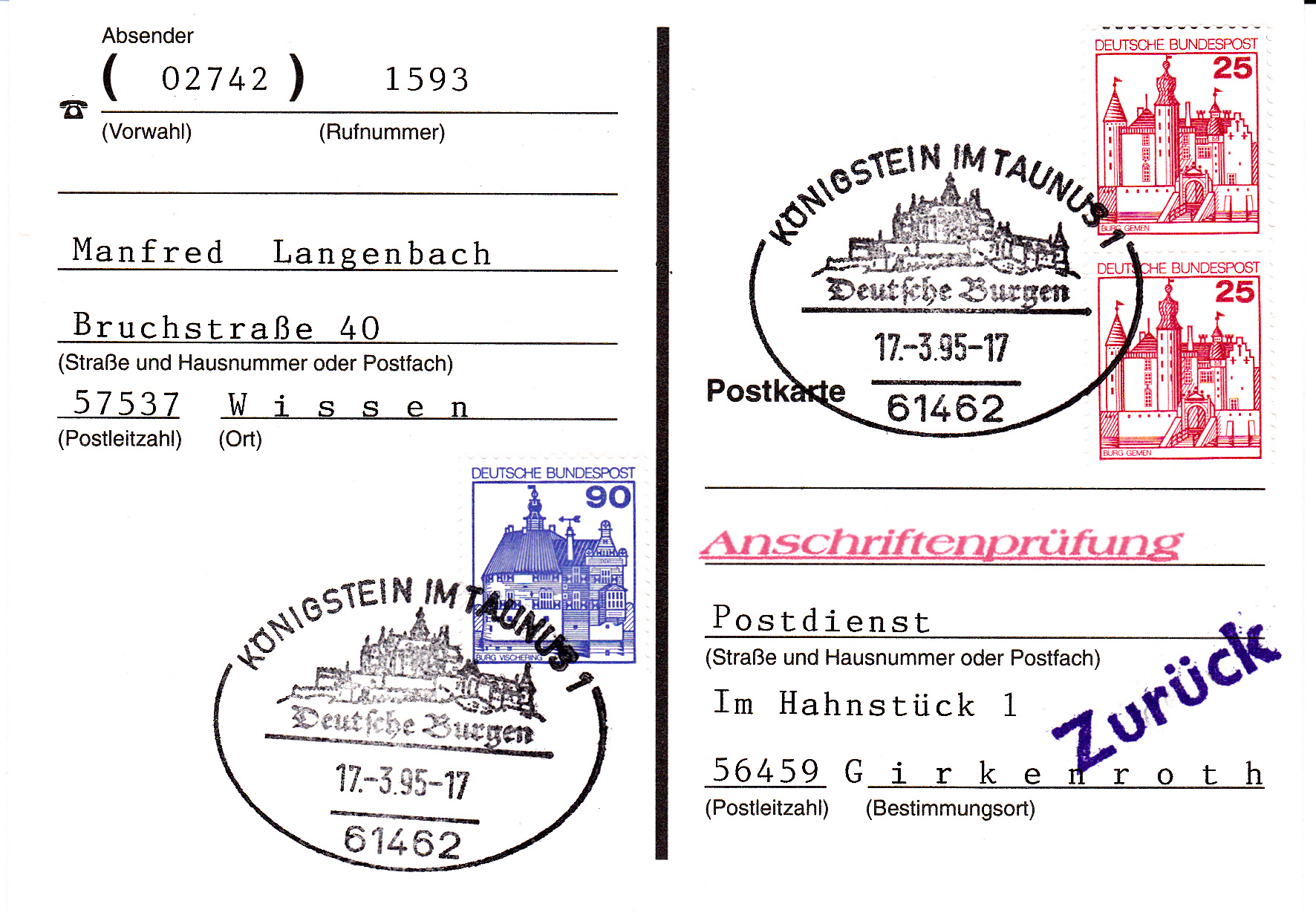 In diesem Stempel aus Königstein wird die Burg abgebildet. Der Stempel wurde auf einer Karte zur Einzelanschriftenprüfung abgeschlagen. Die Gebühr dafür betrug zu diesem Zeitpunkt 160 Pf.