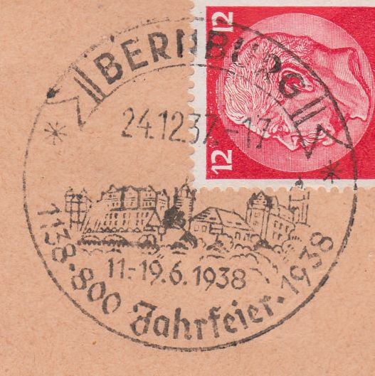 Dieser Beleg vom 24.12.1937 zeigt als Motiv im Stempel das Schloss Bernburg: