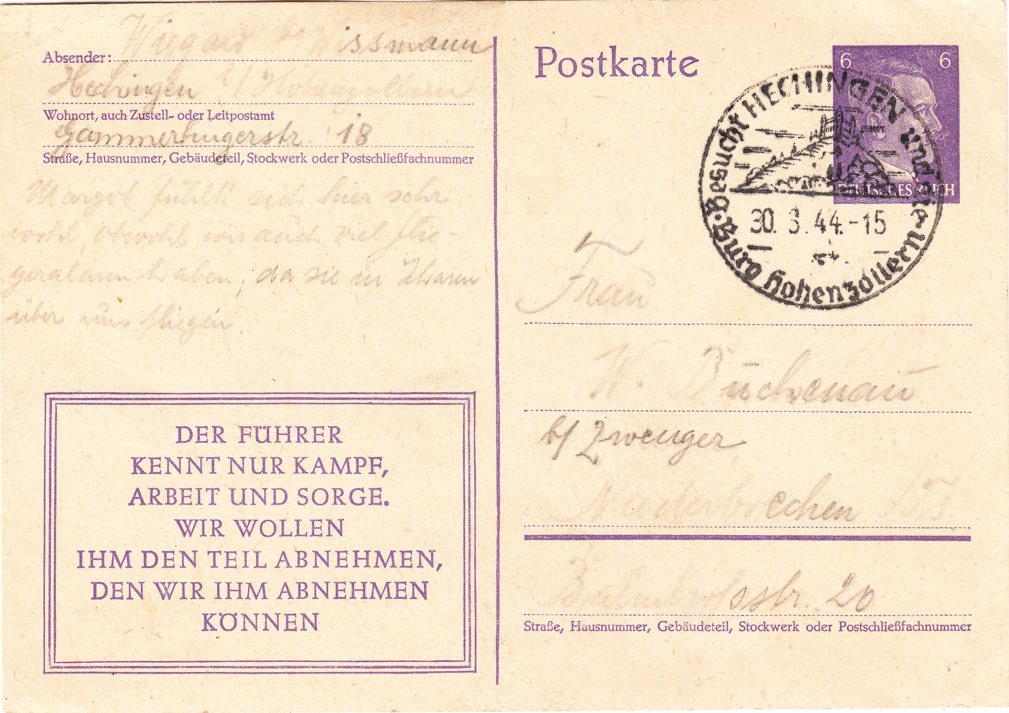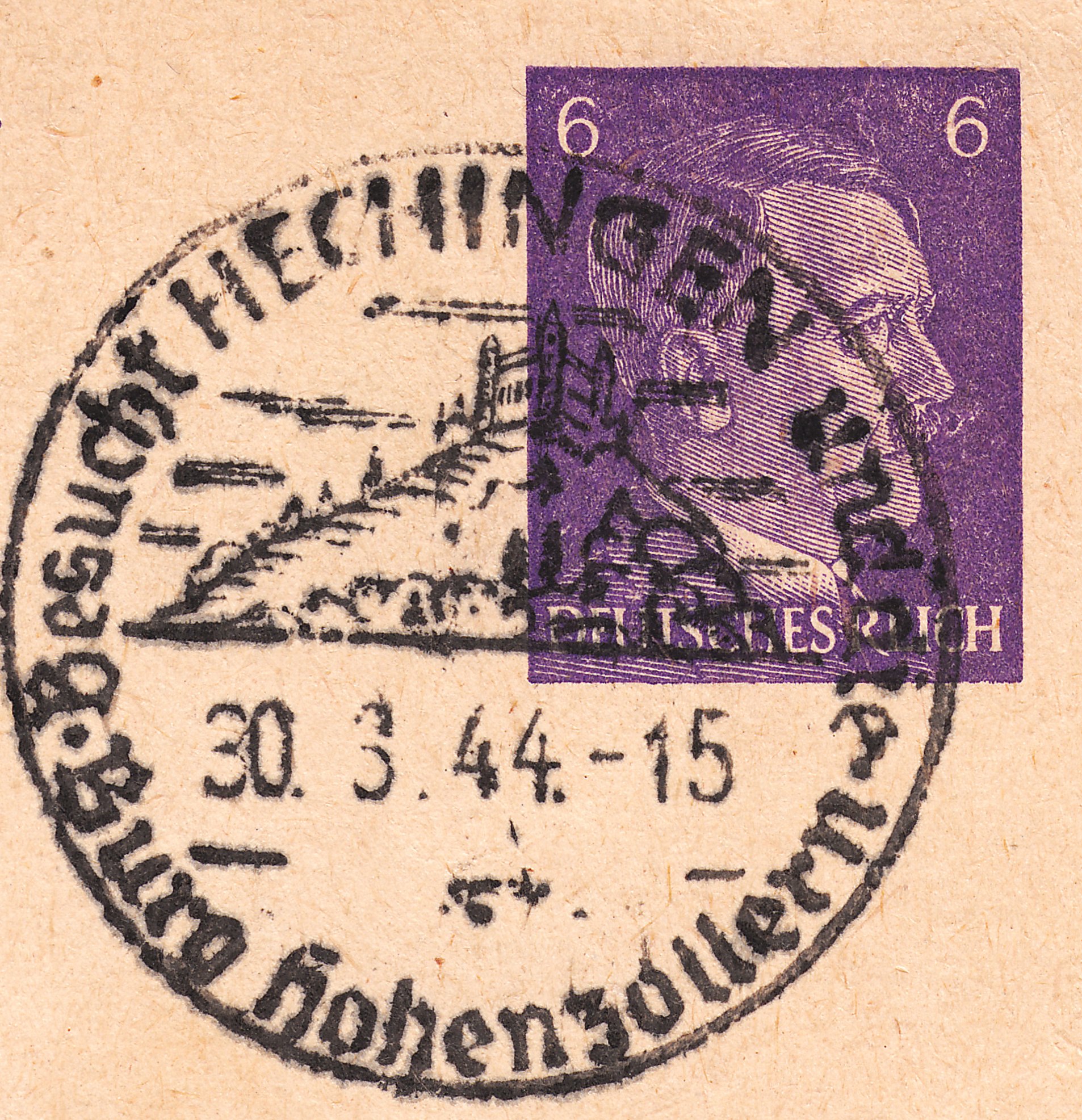 Diese Ganzsache trägt einen Handwerbestempel vom 30.03.1944 aus HECHINGEN mit einer stilisierten Abbildung der Burg Hohenzollern: