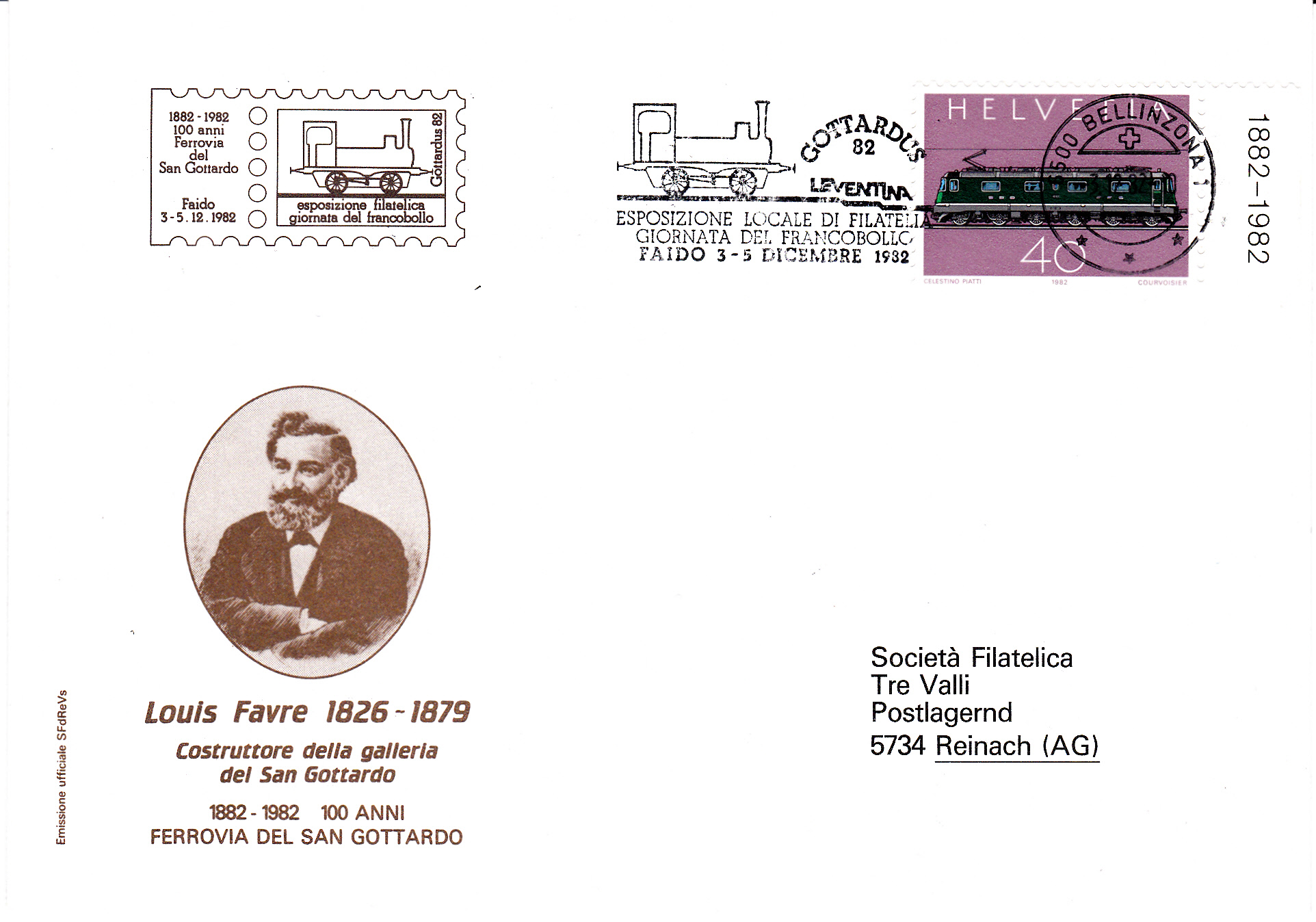 Maschinenwerbestempel aus Belinzona vom 3.12.1982 zu einer Briefmarkenausstellung zum Tag der Briefmarke 1982 und zum Jubiläum "100 Jahre Gotthardbahn" auf einer Sondermarke aus der Schweiz (MiNr 1215) zum Jubiläum der Gotthardbahn.