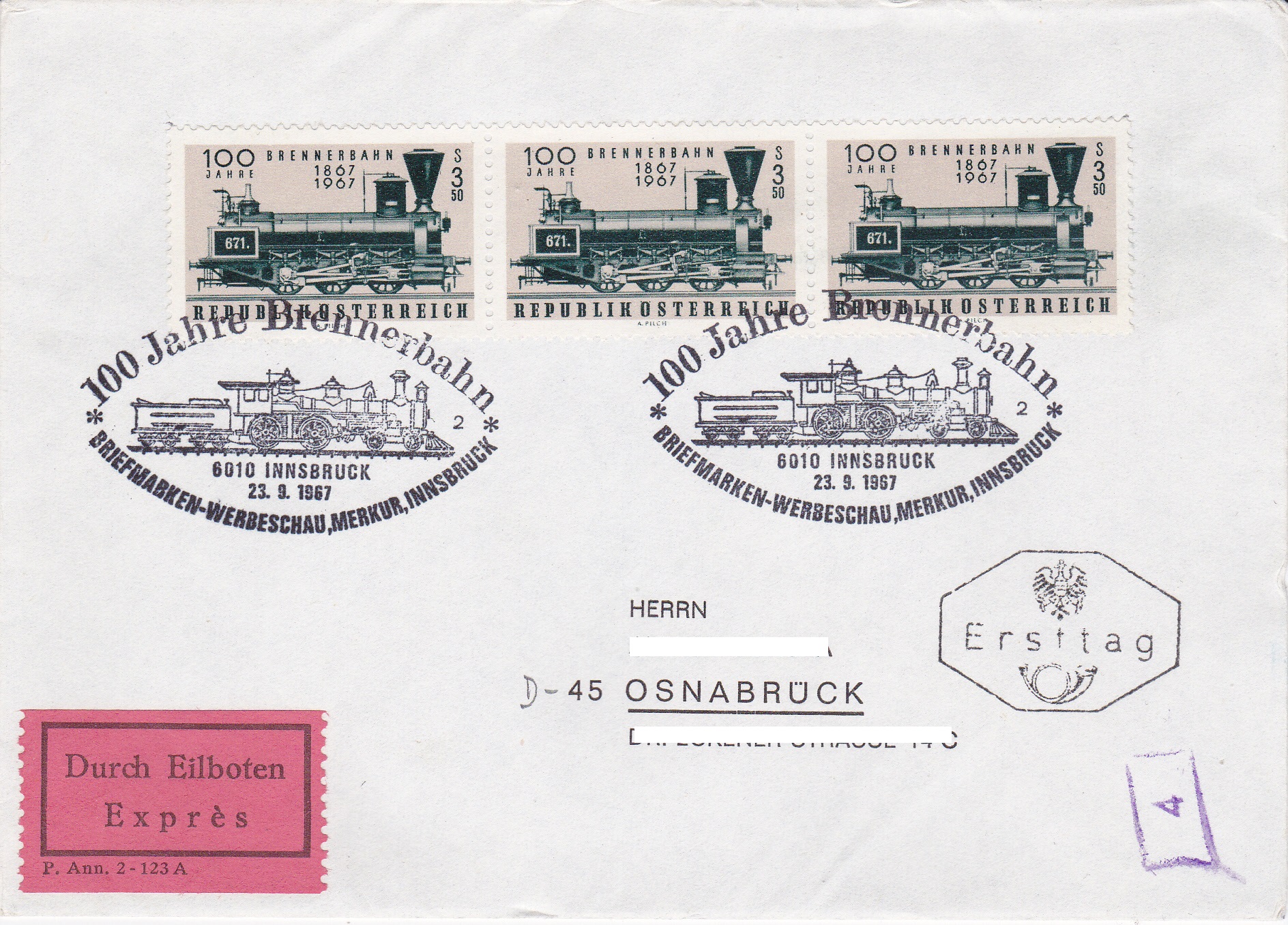 Zum Jubiläum "100 Jahre Brennerbahn" ist in Österreich eine Marke (MiNr 1245) mit einer Güterzug-Tenderlokomotive erschienen. Auf diesem Brief mur Eilzustellung von Innsbruck nach Osnabrück wurden drei dieser Marken zur Frankatur verwendet und am Ausgabetag in Innsbruck mit einem Sonderstempel zum Jubiläum gestempelt. Der Stempel hat die Kennziffer "2".