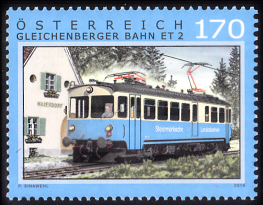 Inn Österreich ist zum Jubiläum "85 Jahre Gleichenberger Bahn" eine Marke (MiNr 3288) mit einem Elektrotriebwagen ET 2 der Gleichenberger Bahn im Bahnhof Maierdorf erschienen.