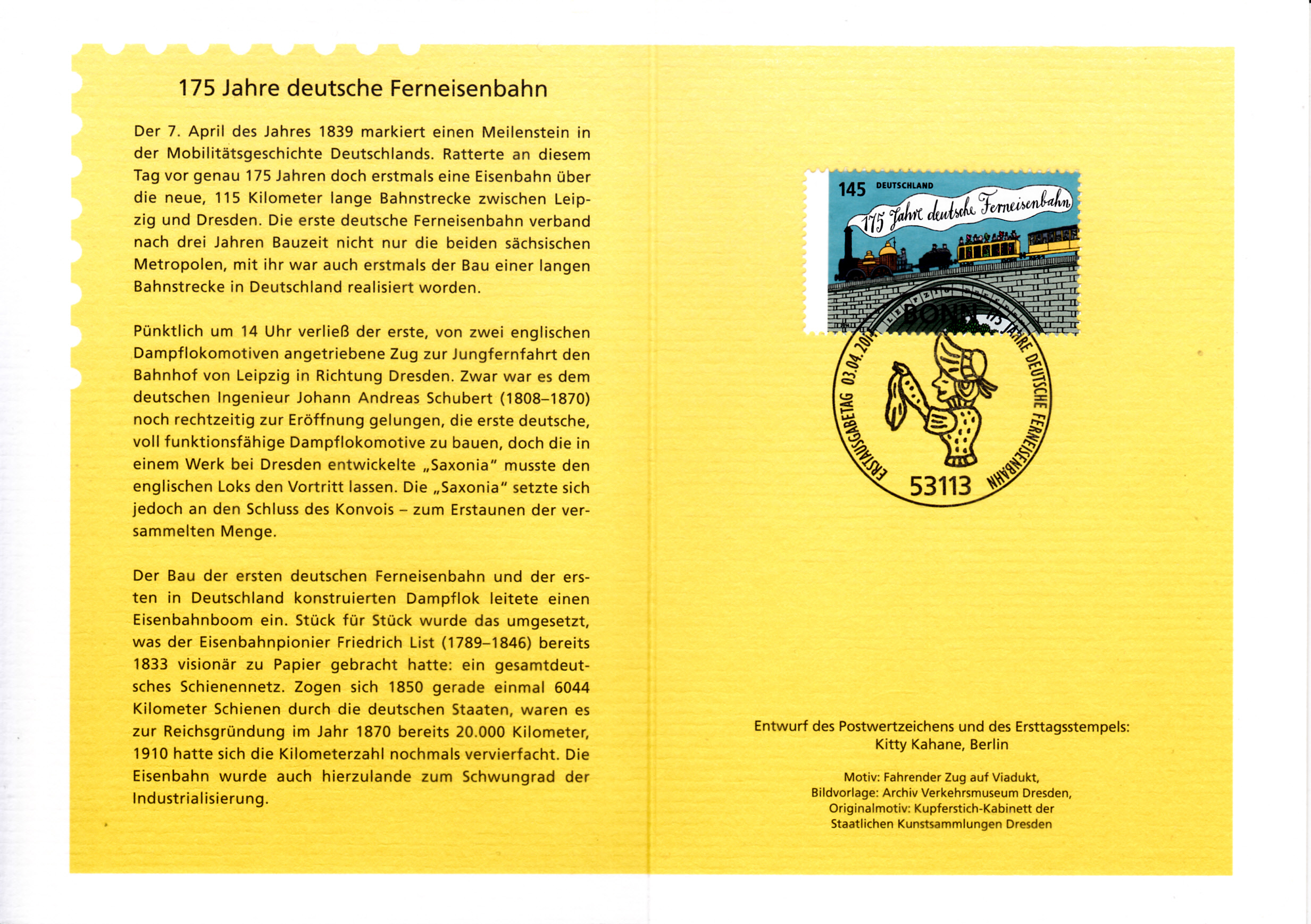 Die MiNr. 3070 (Ausgabe 3.April 2014) zeigt einen historischen Zug auf einer Brücke. Und er scheint wie vor 175 Jahren von Leipzig nach Dresden zu fahren. Mitten durch das schöne Sachsenland.