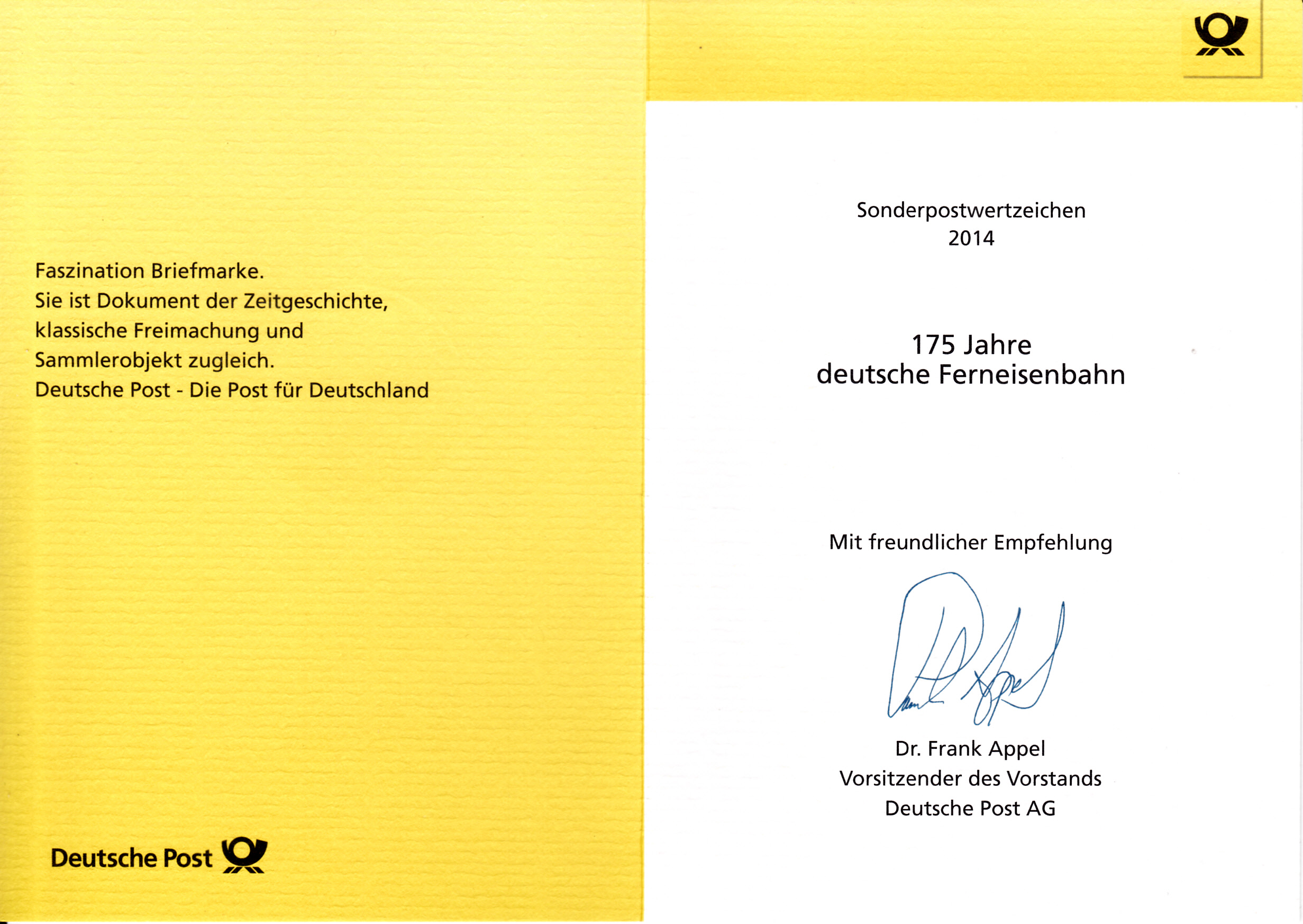 Klappkarte des Vorstandsvorsitzenden der Deutschen Post AG mit der Marke der Deutschen Post (MiNr 3070) "175 Jahre deutsche Ferneisenbahn" und dem Ersttagsonderstempel Bonn.
