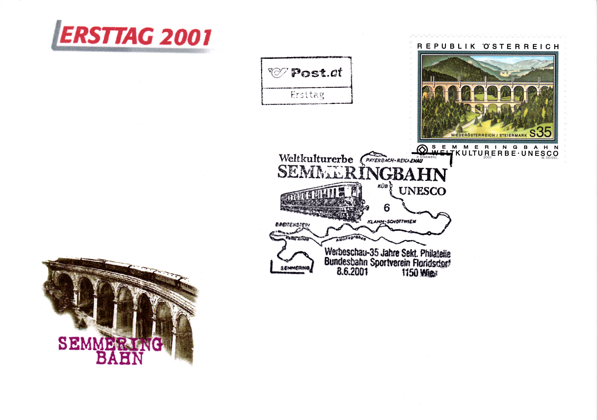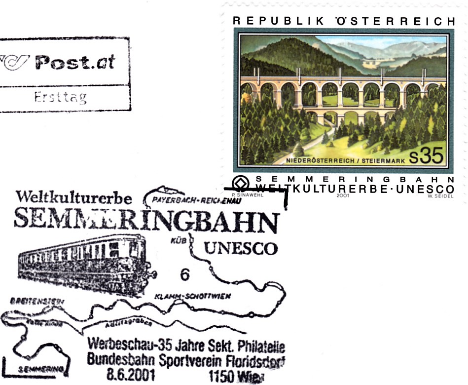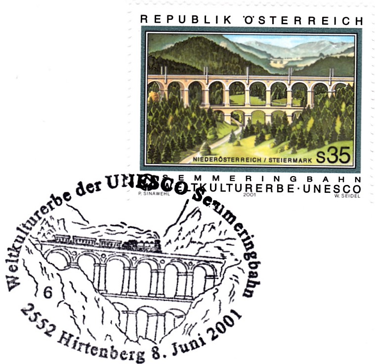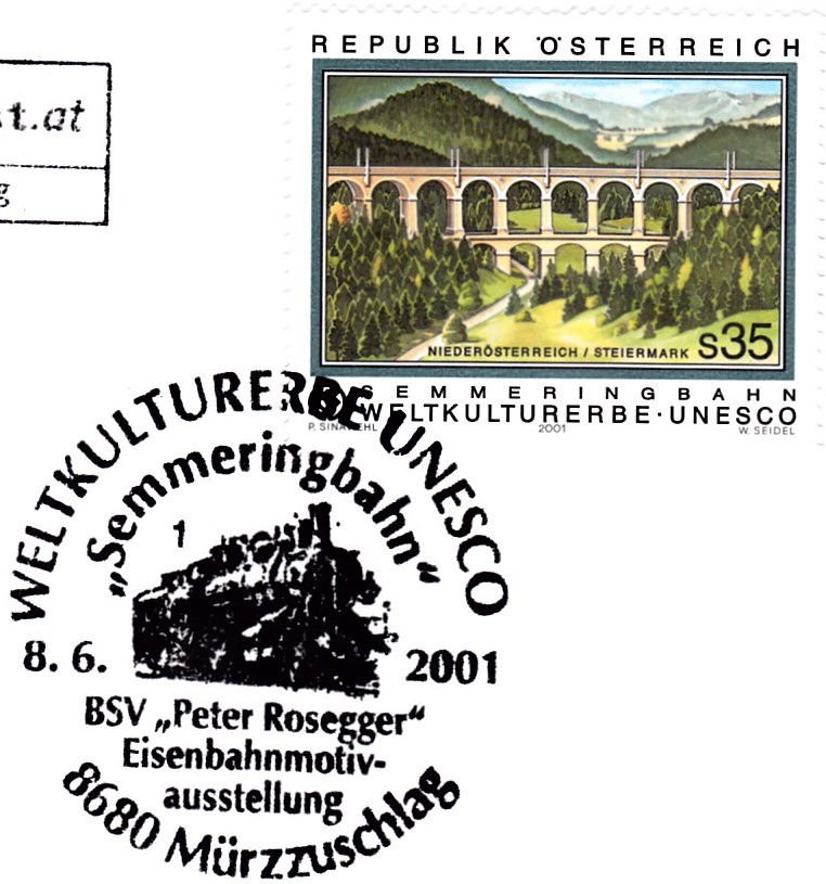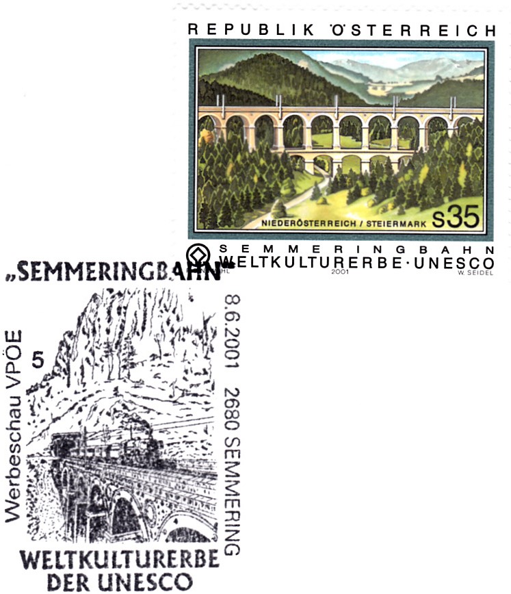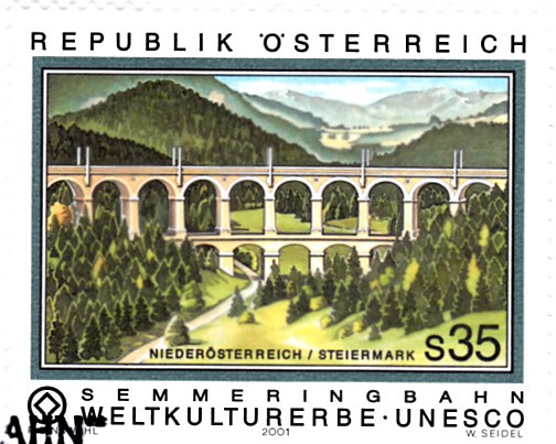 Auf dieser Marke aus Österreich (MiNr 3233) sehen wir einen Zug der Semmeringbahn mit Dampfloks der Reihen 95 und 33 auf dem Höllgrabenviadukt (um 1925).