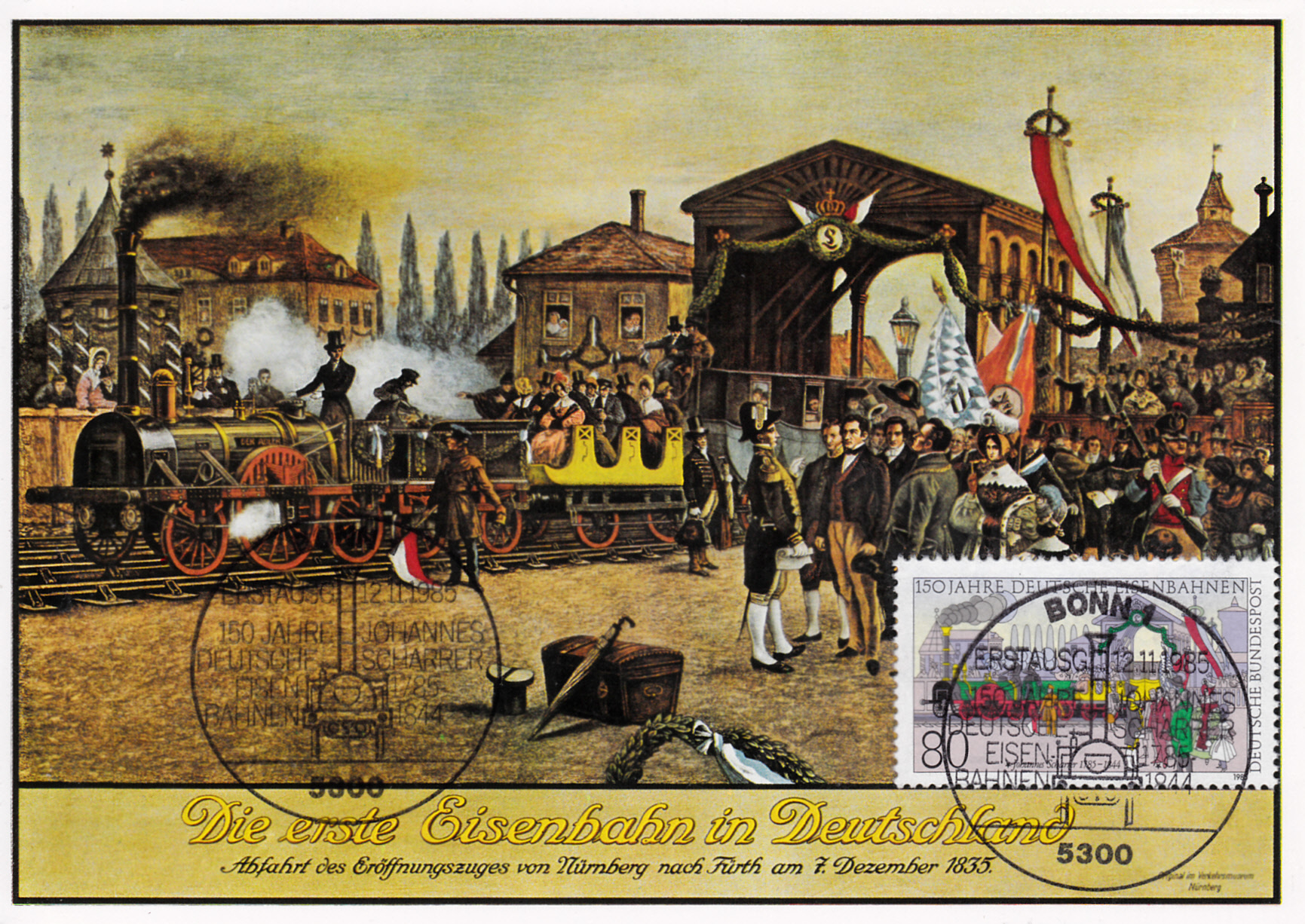 Maximumkarte mit der Marke zum Jubiläum "150 Jahre Deutsche Eisenbahn" der Deutschen Bundespost (MiNr 1264) wurde und dem Ersttagsonderstempel Bonn. Die Karte zeigt die "Erste Fahrt des Adler von Nürnberg nach Fürth am 7. Dezember 1835" (Vorlag für das Markenbild).