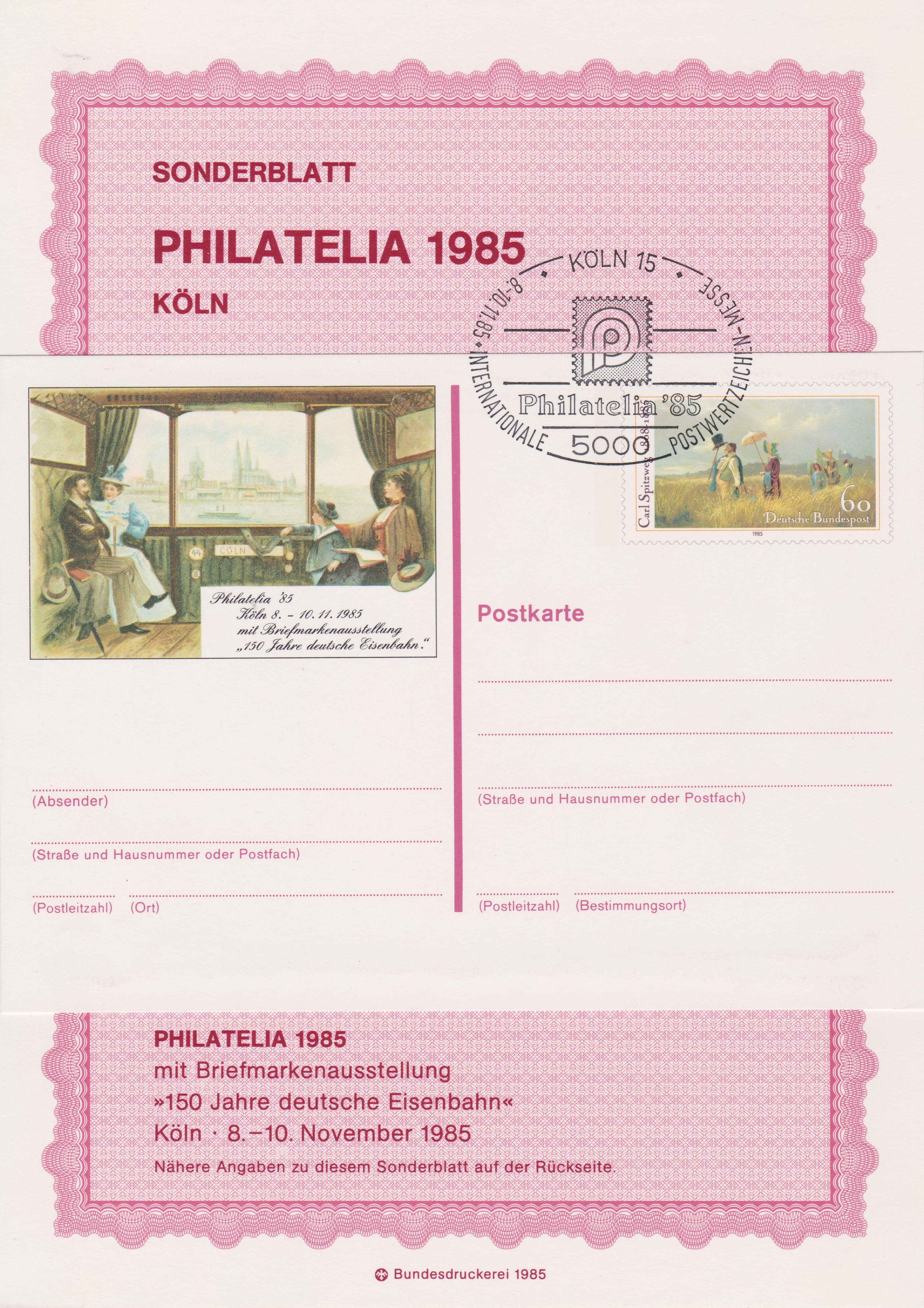 Dieses "SONDERBLATT" mit Druckvermerk "Bundesdruckerei 1985" wurde zur Philatelia ´85 in KÖLN 15 aufgelegt: