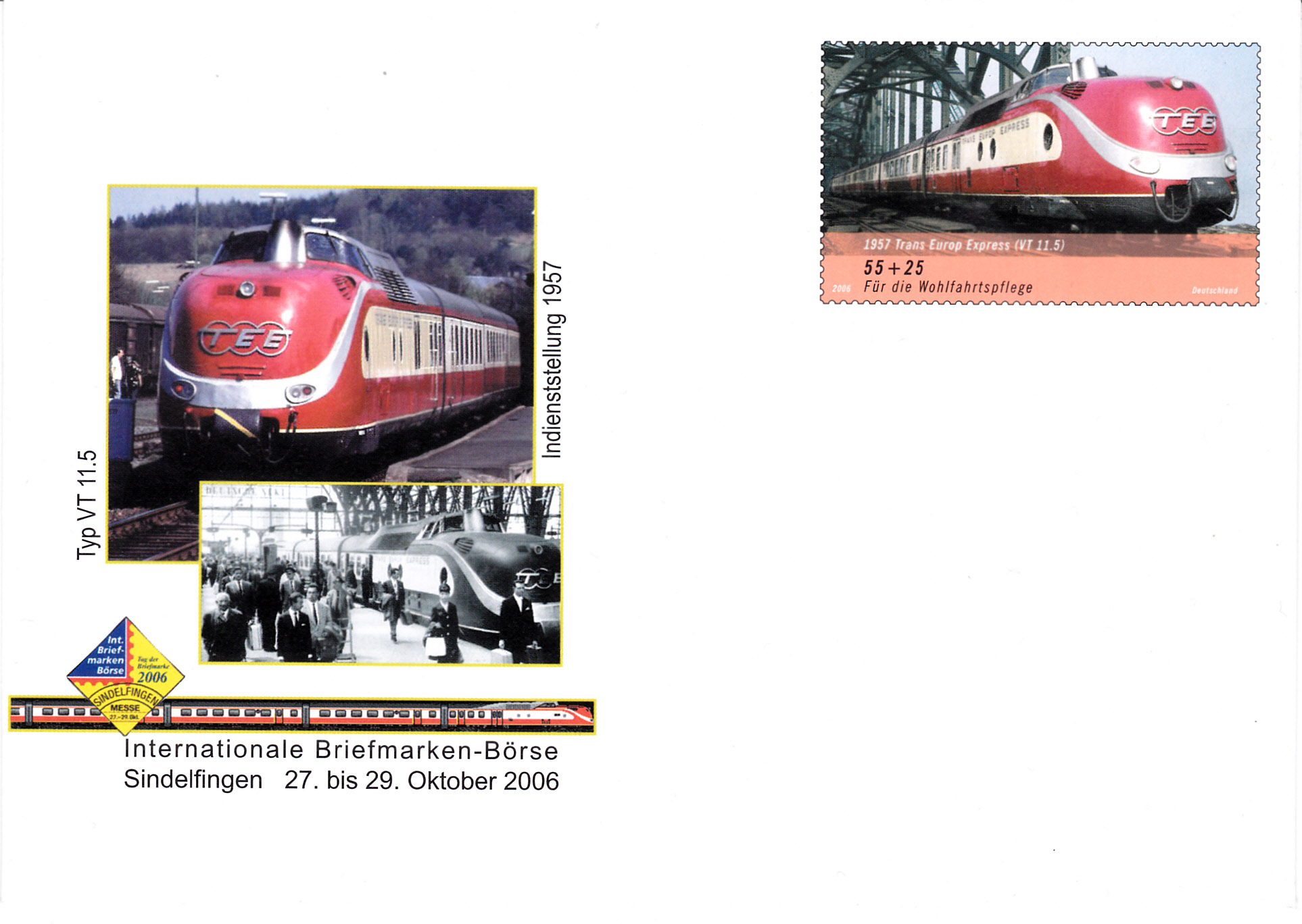 Zur Briefmarken-Börse 2006 in Sindelfingen erschien ein Messeumschlag (MiNr USo 123) mit dem Wertstempel dieser Marke mit Trans Europ Express VT 11.5 aus dem Jahre 1957. Hier zeige ich einen nicht verschickten Umschlag.