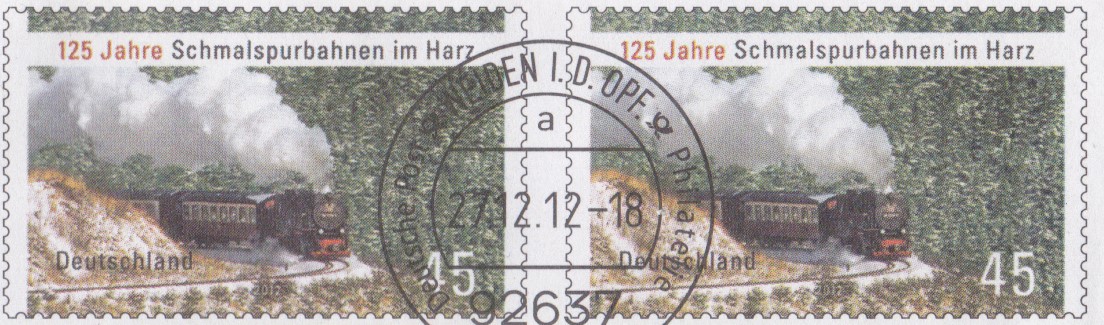 Dieser Ganzsachenumschlag (MiNr EA F637) im Format 229x114 mm hat zwei Wertstempel mit der 45 Cent-Marke "125 Jahre Schmalspurbahnen im Harz" (MiNr 2910). Die Vorausentwertung trägt das Datum "27.12.12".