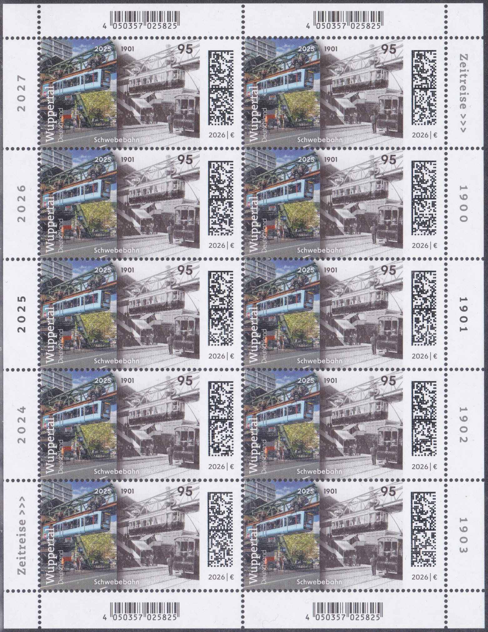 In der Serie "Zeitreise durch Deutschland" ist bei der Deutschen Post eine Marke (MiNr 3943) mit der Schwebebahn in Wuppertal, auf Photographien der Jahre 1901 und 2025. Hier zeige ich ein Eckrandstück mit EAN-Codierung.
