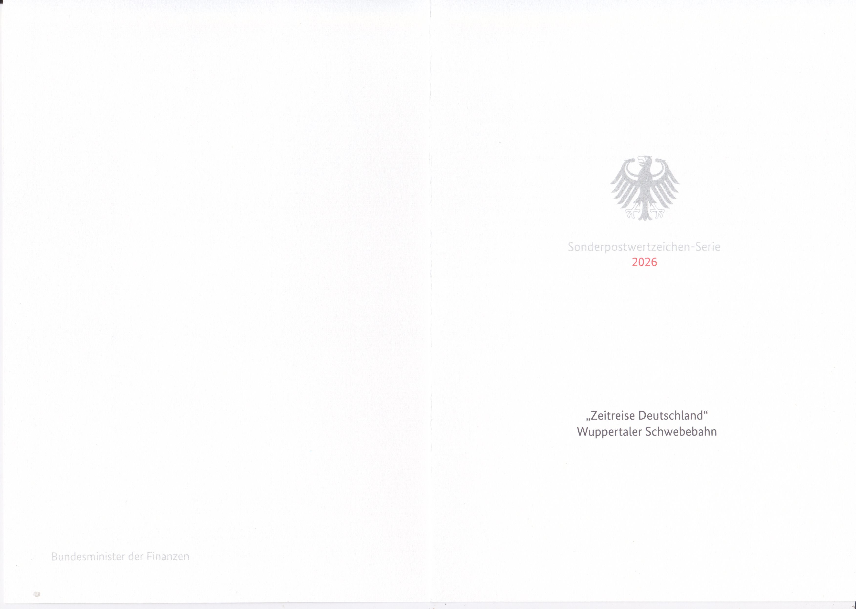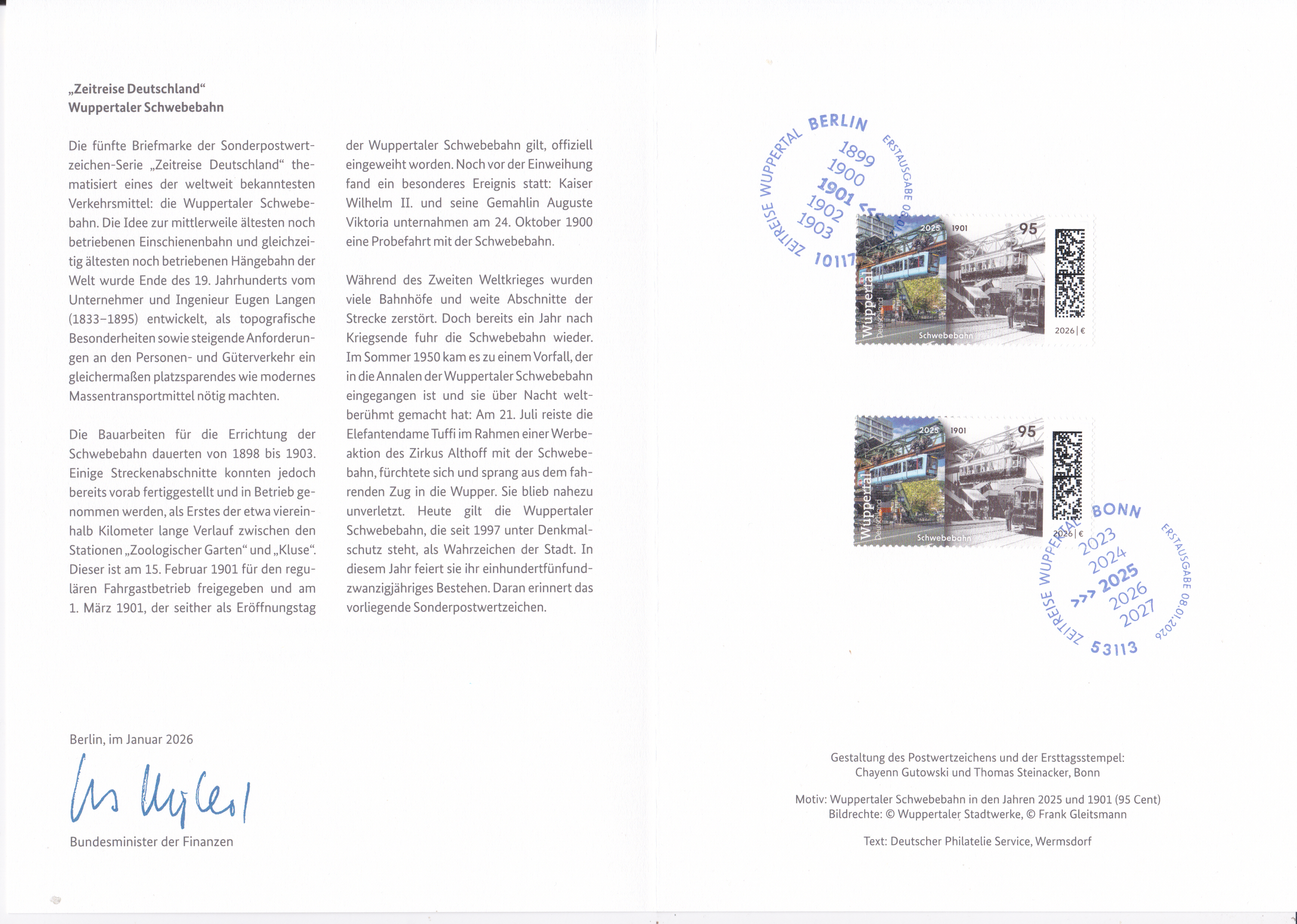 Ministerkarte des Bundesministers für Finanzen mit zwei Marken aus der Serie "Zeitreise durch Deutschland" mit dem Motiv "Wuppertal" (MiNr 3943) mit den beiden Ersttagsonderstempel Bonn und Berlin.