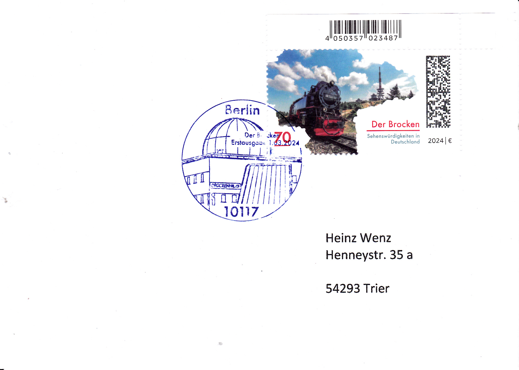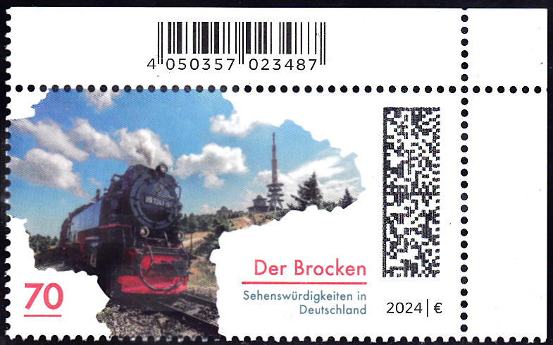 In der Serie "Sehenswürdigkeiten in Deutschland" ist diese Marke (MiNr 3817) mit der Abbildung einer Lokomotive der Brockenbahn vor der Gipfelstation erschienen. Hier zeige ich eine Marke vom Eckrand mit EAN-Codierung.
